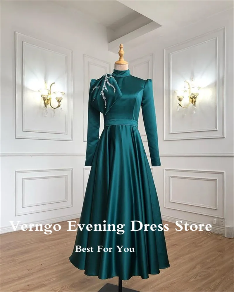 Платье женское вечернее, с высокой горловиной, до середины икры, из атласа с длинным рукавом