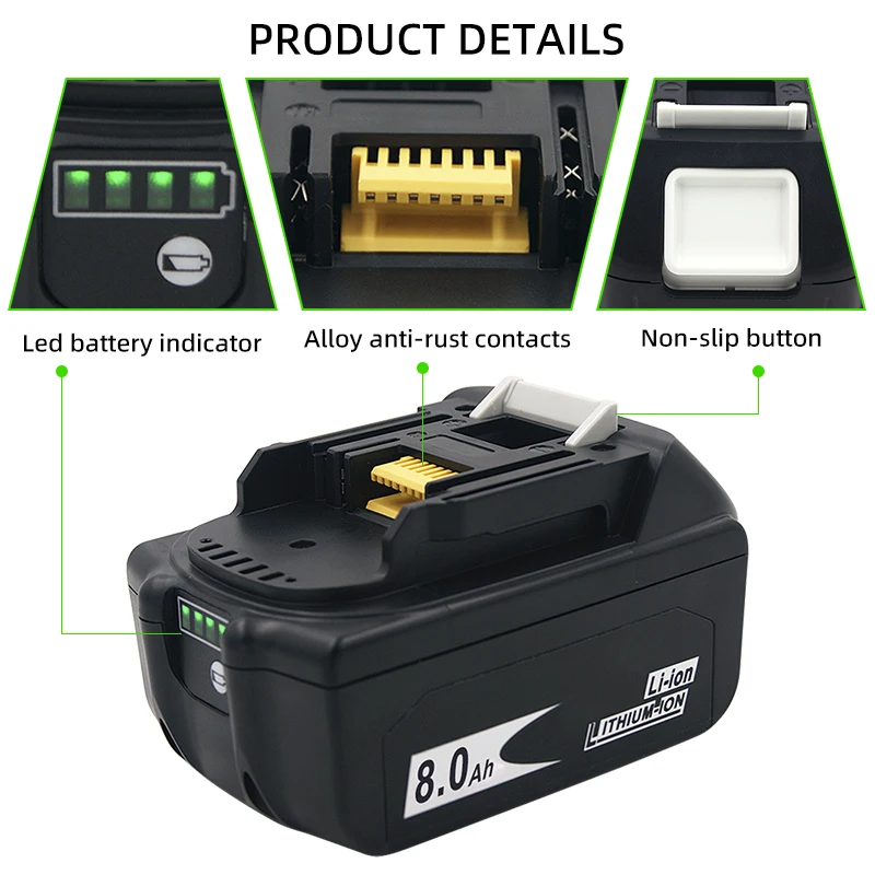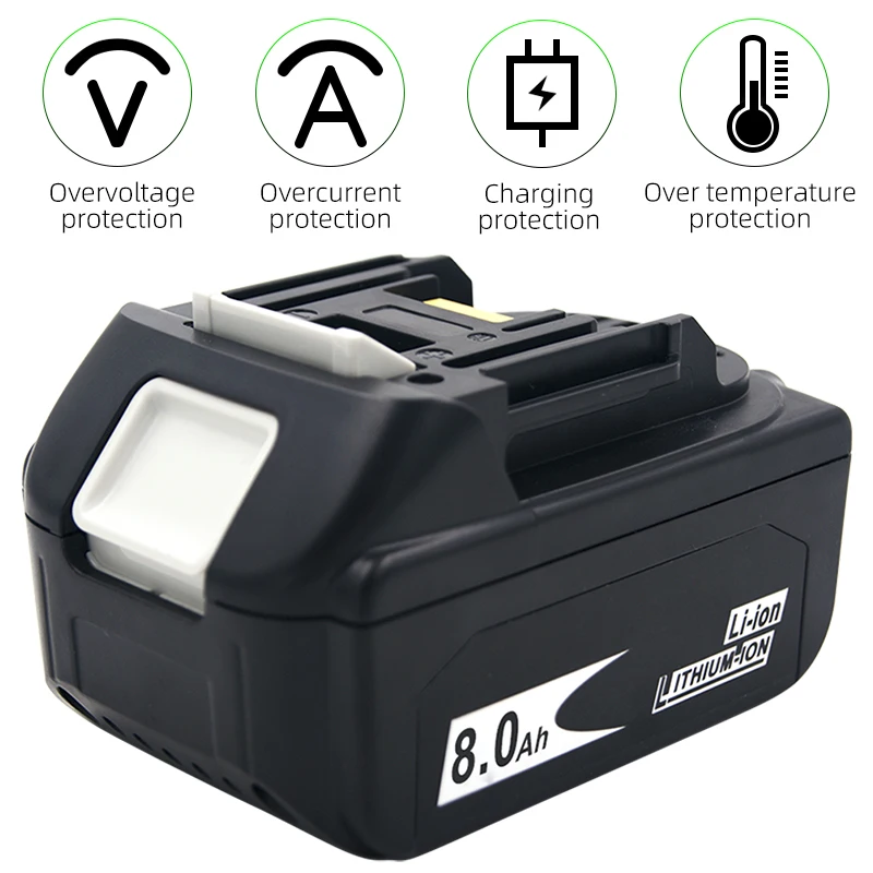 Модель: самая последняя и безопасная аккумуляторная батарея BL1860B для электроинструментов Makita Номинальное напряжение: 18 вНоминальная емкость: 6000 мАч/8000 мАчТип батареи: литий-ионныйГарантия: 1 год