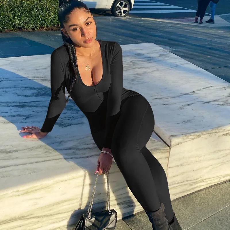 Женский осенне-зимний комбинезон для йоги с V-образным вырезом и длинным рукавом, эластичный Облегающий комбинезон на молнии, эластичная уличная одежда, повседневные Комбинезоны, 2021