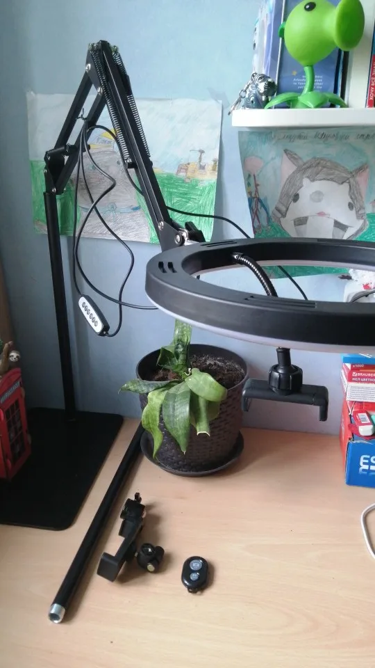 Вместо кронштейна прислали на подставке, плюс дополнительный держатель телефона. Брал детям чтобы снимать видео при рисовании. Не кретично, приспособим как нибудь. Кронштейн жидкий, если часто менять фиксацию то надолго не протянет. Лампа отличная, есть теплый свет, заменяет настольную. Пульты работают, режимы переключают, видео и фото запускают на телефоне. Покупкой довольны