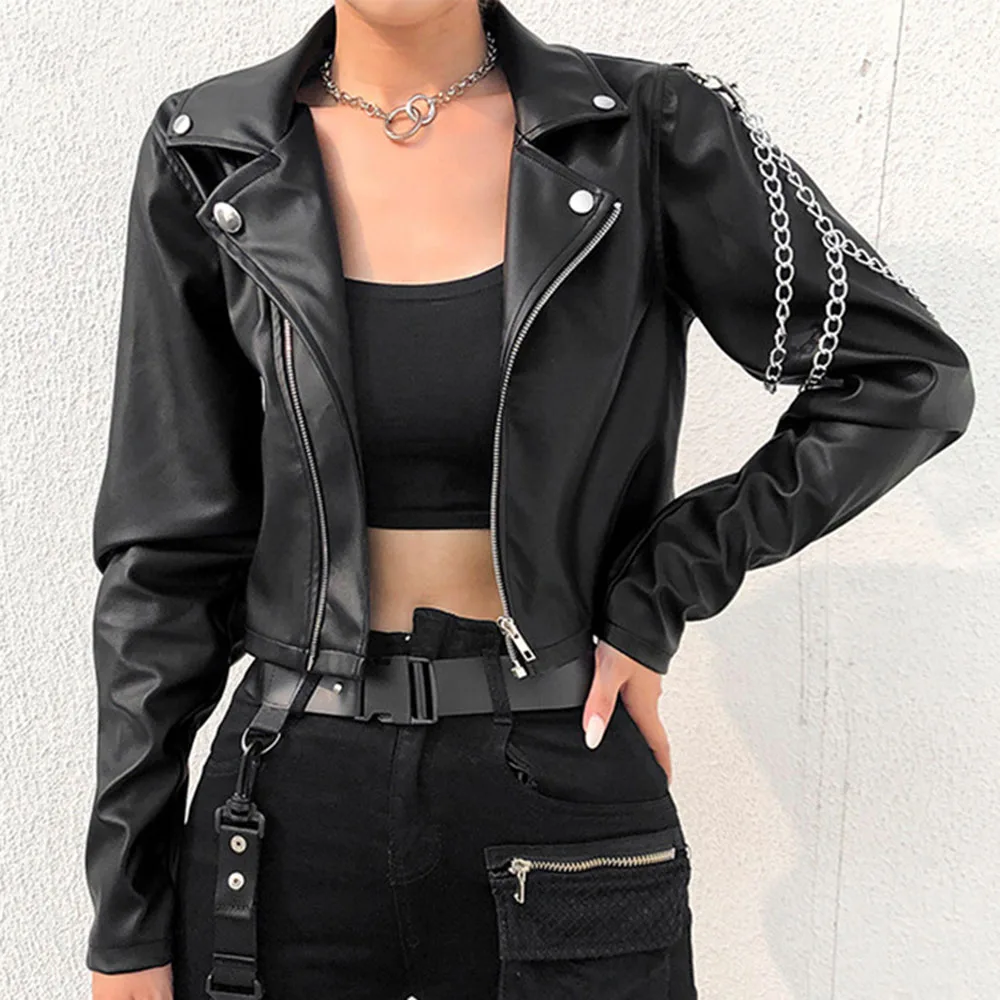 Женская куртка из ПУ кожи, с отложным воротником и длинным рукавом