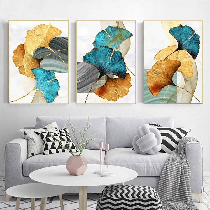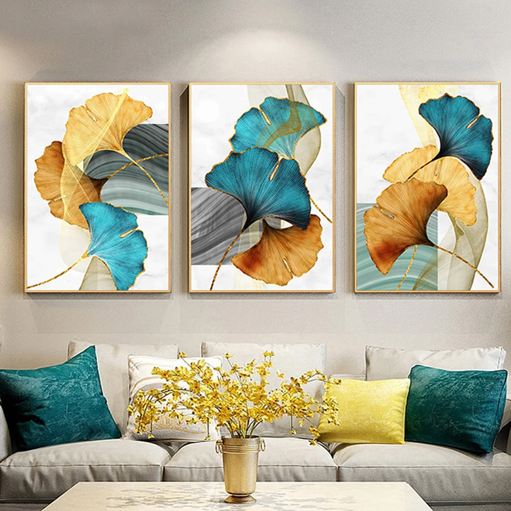 Синий зеленый желтый золотой лист растение цветок холст плакат абстрактная живопись Настенная печать современные картины в скандинавском стиле Декор для гостиной
