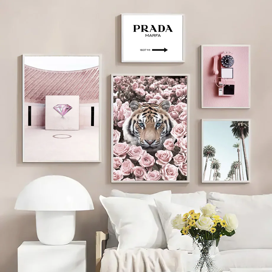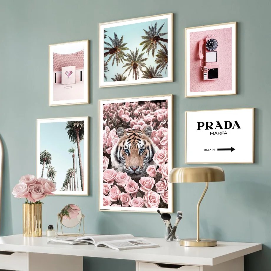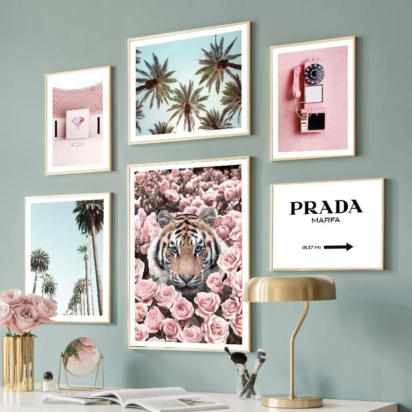 Розовая роза, тигр, телефон, пальмовые деревья, скандинавский постер, модный музейный настенный художественный принт, холст, картина, Декор, фотографии для гостиной