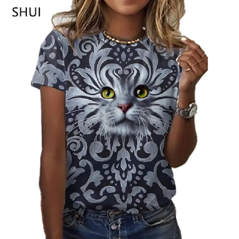 Летняя женская футболка с принтом кошки, модный трендовый топ с круглым вырезом, Повседневная Удобная уличная универсальная одежда