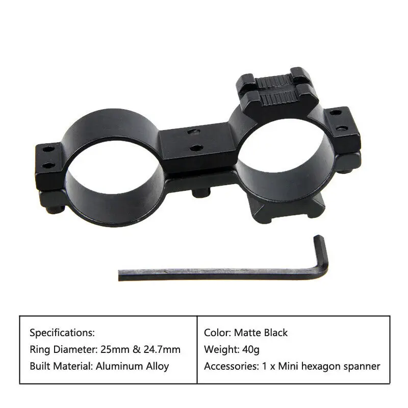 Характеристики:Диаметр кольца: 25 мм и 24,7 ммМатериал корпуса: алюминиевый сплавЦвет: матовый черныйВес: 40 гАксессуары: 1 х мини шестигранный гаечный ключОсобенности:Подходит для прицела, красных точек, фонарика, лазерного крепления.Отлично подходит для крепления на винтовку с дополнительными аксессуарами.Матовая черная отделка выглядит так круто на любом пистолете/ружье.Полностью регулируется с помощью гаек и винтов.