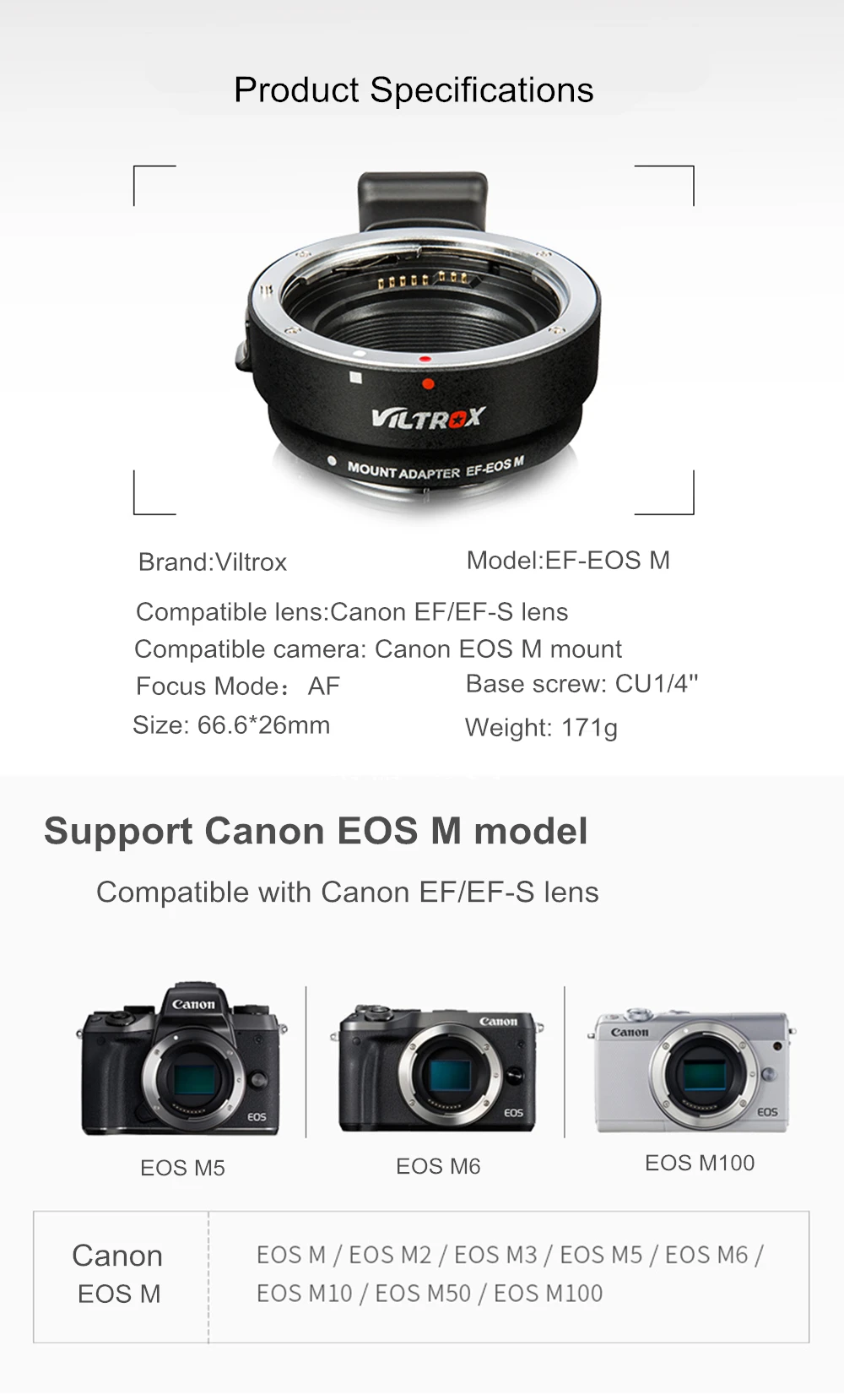 1. Этот Высококачественный адаптер для объектива специально разработан для существующих объективов EOS EF/EF-S к камерам EOS M. С электронными контактами, позволяющими фокусироваться автоматически.2. Адаптер может быть установлен на существующую 60 моделей EF lens group (включая EF-S объектив.3. Полностью электронный адаптер для крепления Подключите Объективы EF, чтобы полностью воспроизвести стабилизатор изображения и производительность съемки AF.