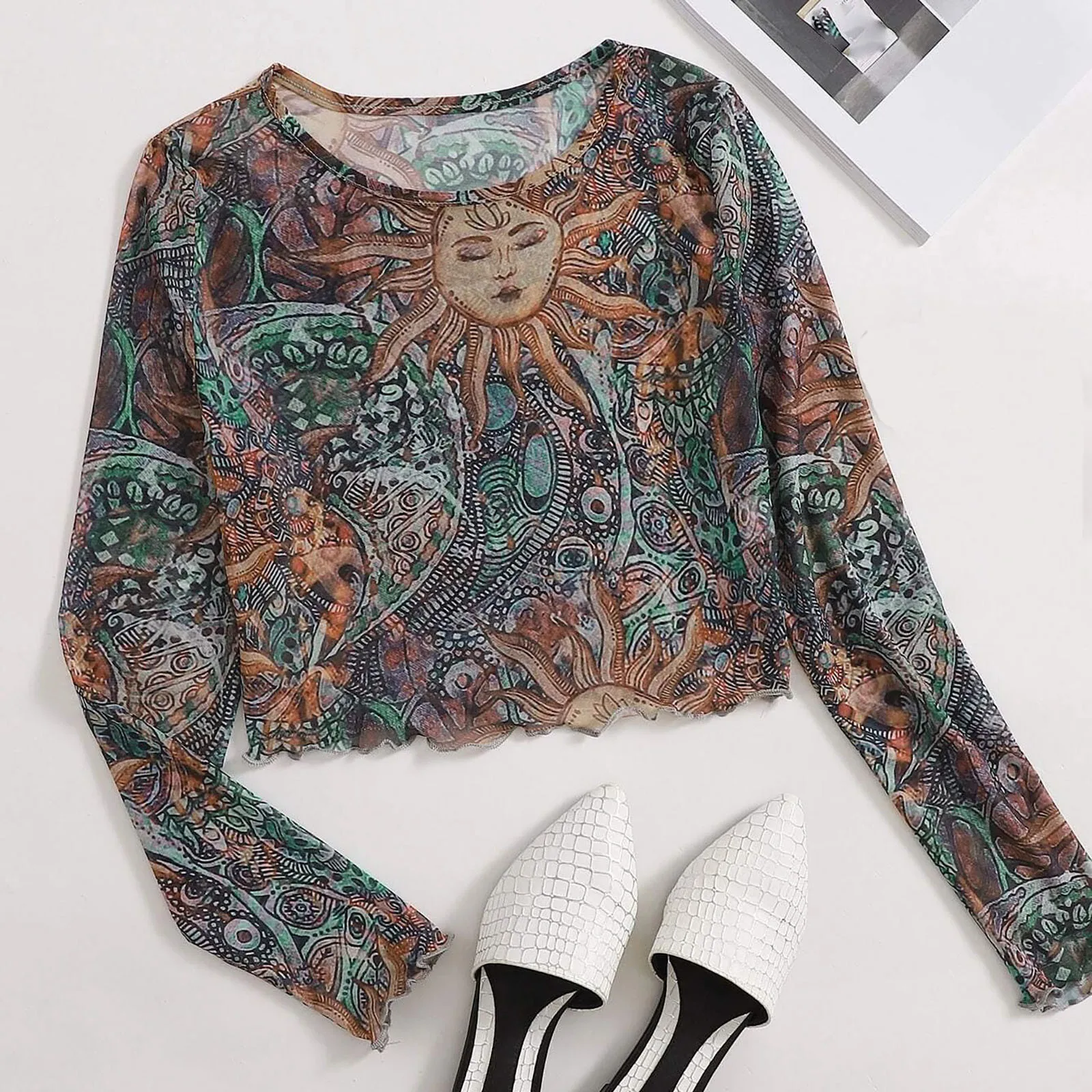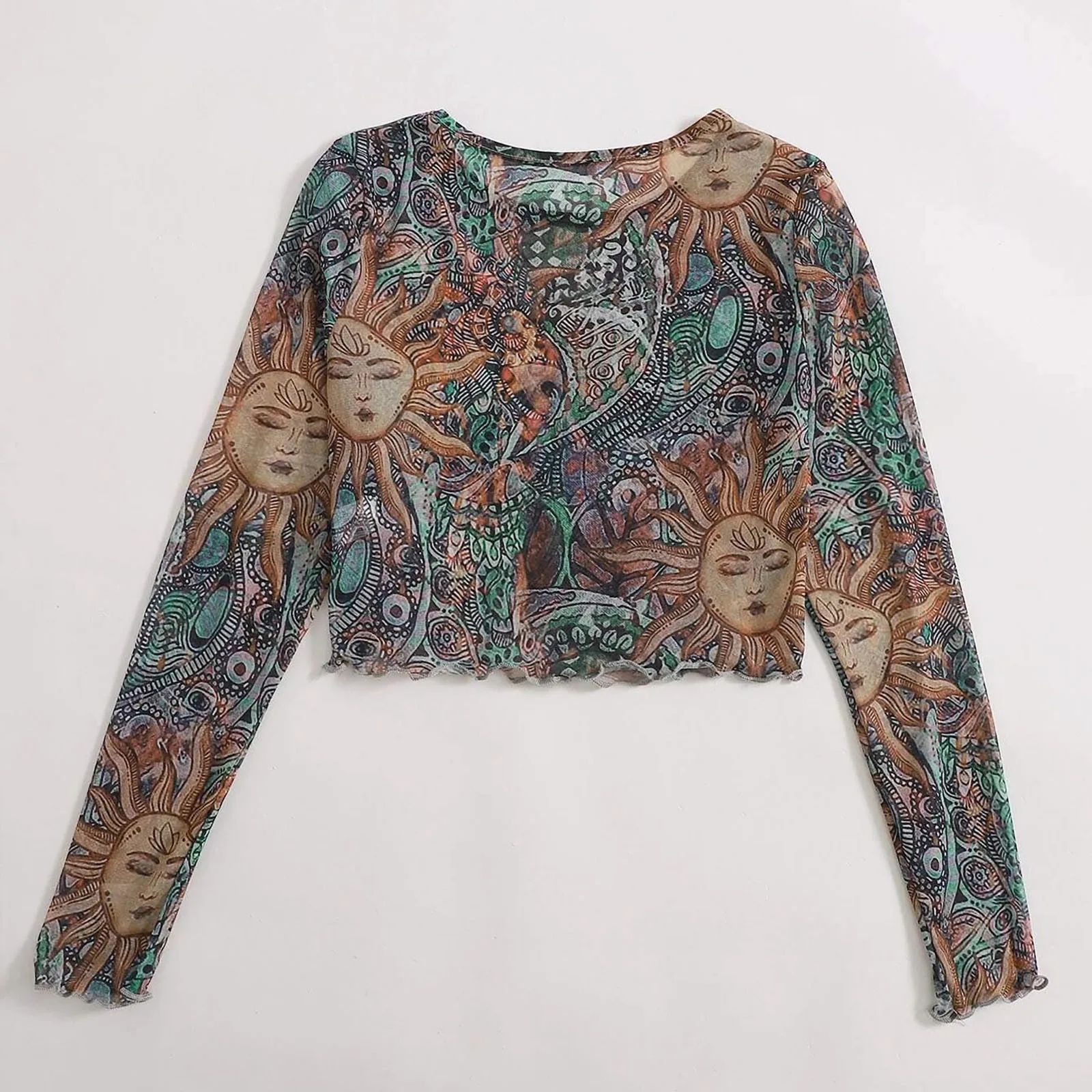 Женская модная прозрачная Сетчатая футболка с принтом Солнца и Луны, футболки с защитой от солнца и длинным рукавом, укороченный топ с круглым вырезом, блузка Рубашки