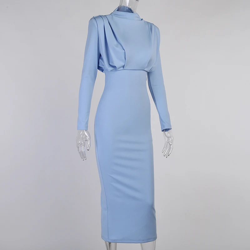 Элегантное женское сексуальное платье с воротником-стойкой облегающее однотонное синее платье до щиколотки осеннее повседневвечерние чное платье с длинным рукавом 2021 модная новинка