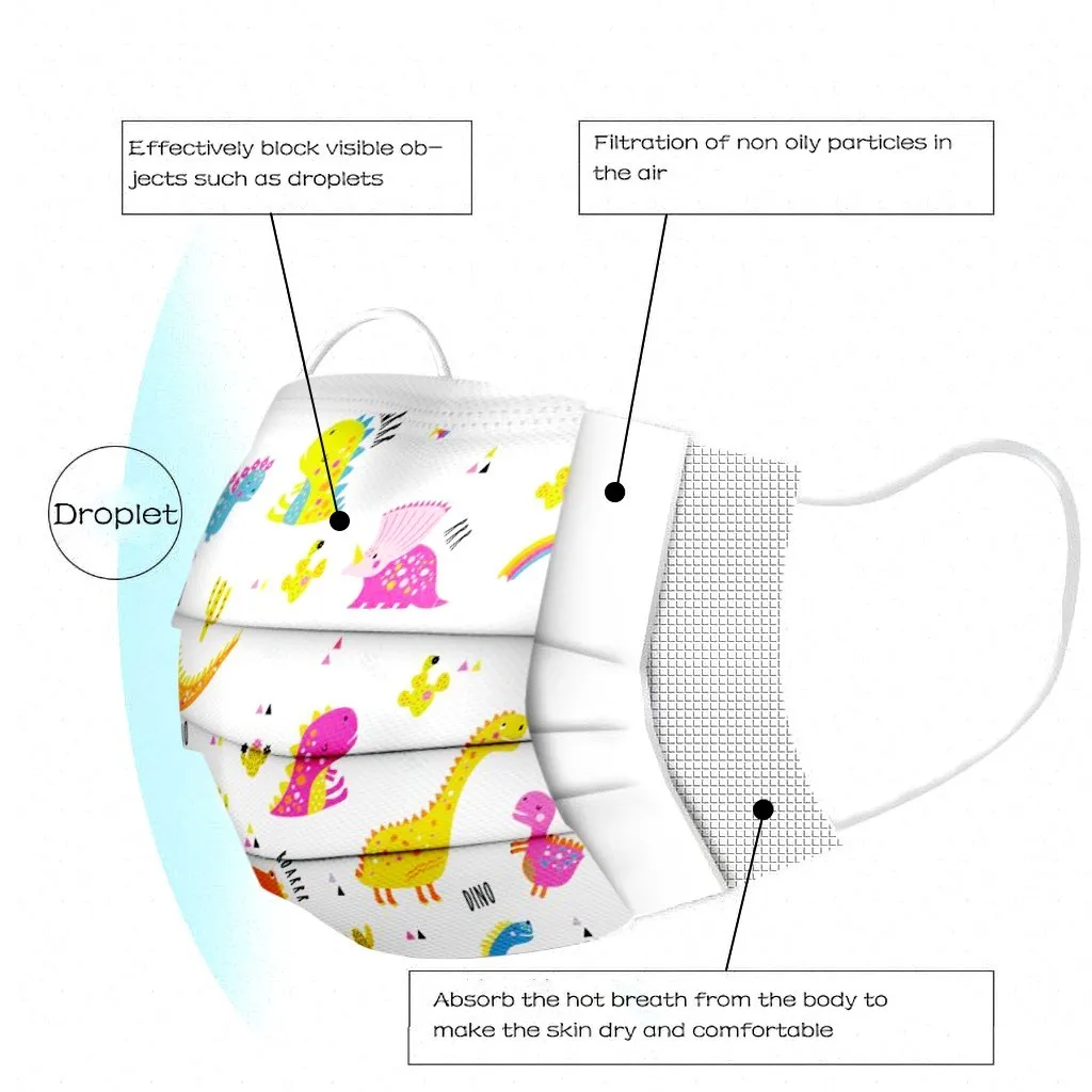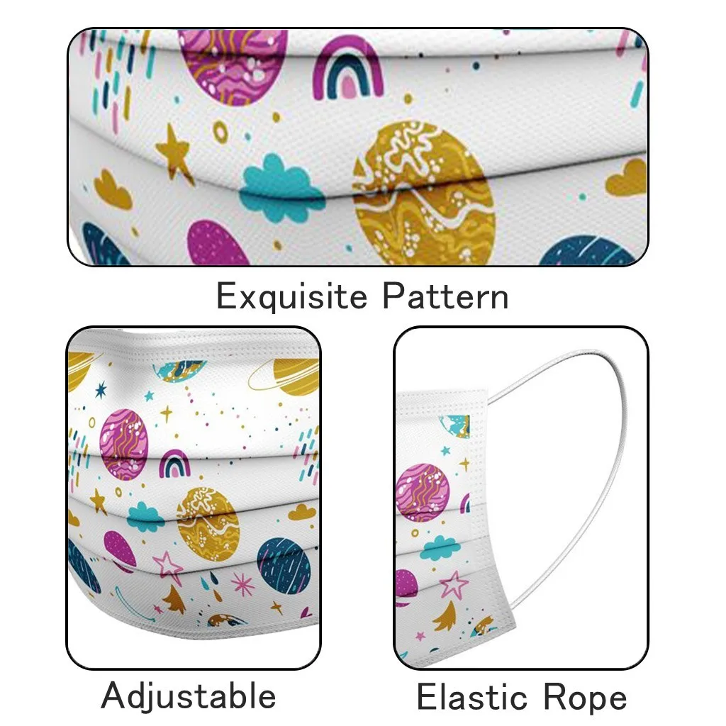 В 3 слоя Нетканая одноразовая маска изготовлена из 3 слоев нетканого материала, Безопасен и безопасен для использования. Дышащий материал и милый Узоры, которые делают его полезным и модным. Специальный 3 слоя из нетканого материала Дизайн, обеспечивает некоторую защиту от пыли, автомобильных выхлопных газов, Пыльца и т. д. эластичная Ушная петля, легко носить и не давит на уши. Маникюрный салон или любые другие области, где может потребоваться защита