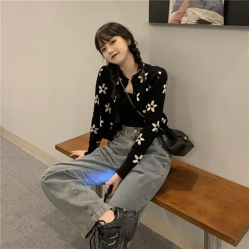 Женский вязаный короткий кардиган, весна-осень 2022, женский цветочный свитер, пальто, повседневный женский топ с круглым вырезом
