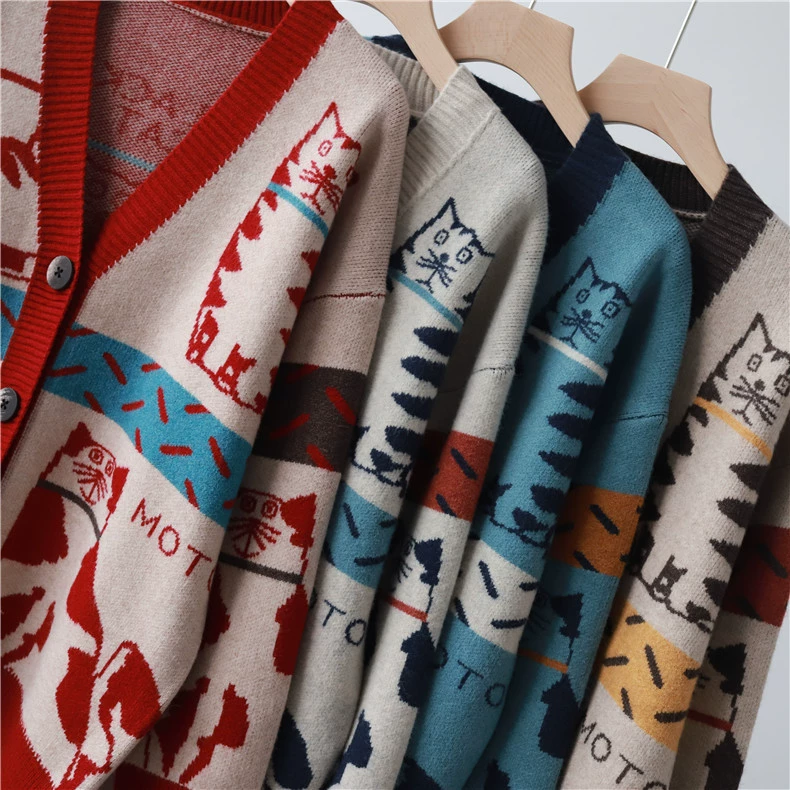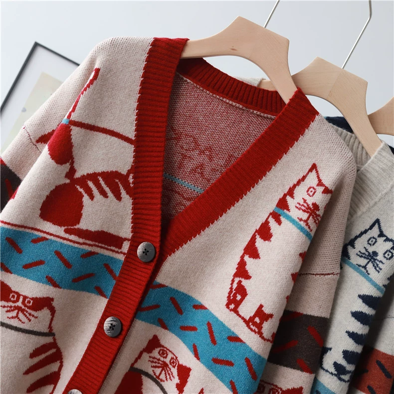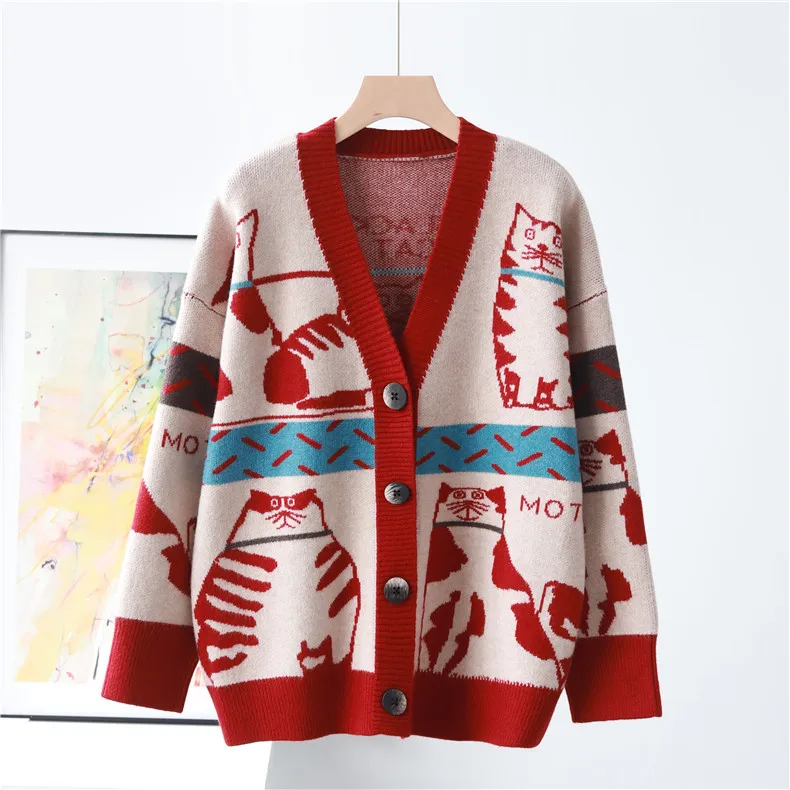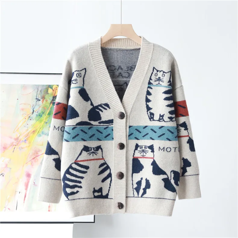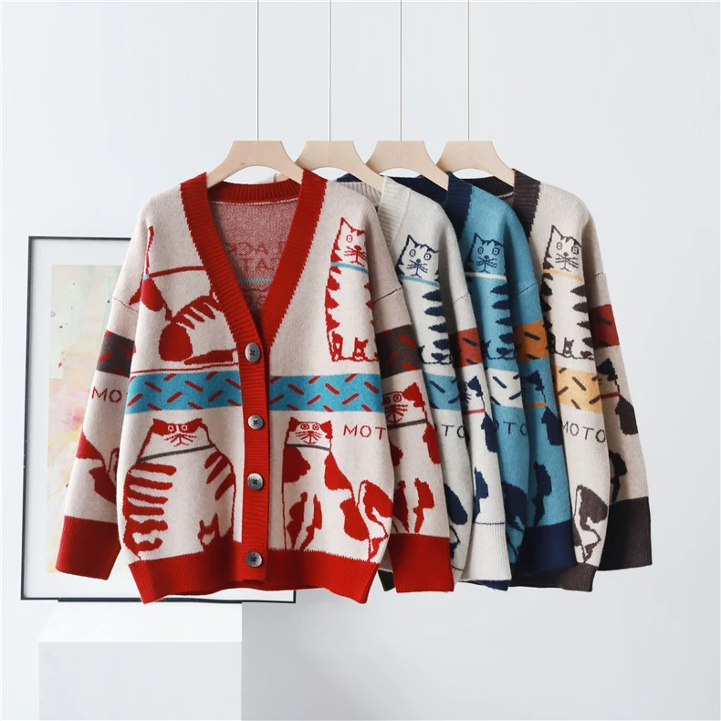 Свободный свитер, кардиган, Женские Ретро вязаные свитера с мультяшным рисунком кота, весенне-осенние хлопковые Корейские вязаные свитера, пальто для женщин