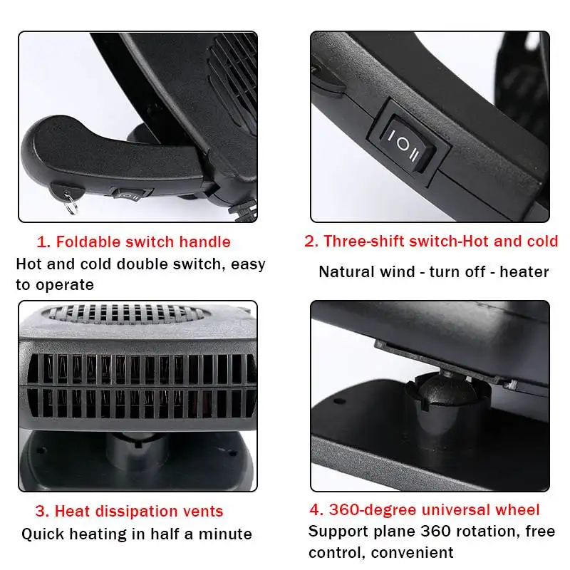 Особенности:-2 в 1 12 В/24 В автоматический нагревательный вентилятор с поворотным выходом-Поставляется с выдвижной ручкой, легко носить с собой.-Вращение на 360 градусов, легко регулируется под нужным вам углом-Бесщеточный двигатель обеспечивает бесшумную работу.-Можно быстро нагреть в течение одной минуты.-Эффективная конструкция рассеивания тепла.-12 В/24 В 300 Вт Подключите вентилятор, обогреватель и размораживатель.-Простые в использовании подключения вентилятора нагревателя к розетке аксессуаров вашего автомобиля для питания.-Вставляется в гнездо прикуривателя.-Переключатель для выбора режима вентилятора или нагревателя.-Подходит для автомобиля, грузовика, фургона, дома на колесах и т. д.-Прочный прорезиненный чехол.-Поставляется с пакетом клейких прокладок для фиксации.Спецификация:Тип: автомобильный обогреватель 2 в 1Материал: АБС-пластикИсточник питания: автомобильный аккумуляторМощность: 300 ВтВход: 12 В/24 ВРазмер: дюйма/13 см * дюйма/14 см * дюйма/4 смДлина шнура: прибл. 130 смЦвет: черныйПосылка:1 автомобильный обогреватель и охладитель 2-в-11x руководствоПримечание:Есть 2 вида напряжения: В. Пожалуйста, заранее сообщите нашим сотрудникам Службы поддержки напряжение желаемого товара, в противном случае мы отправим его случайным образом.