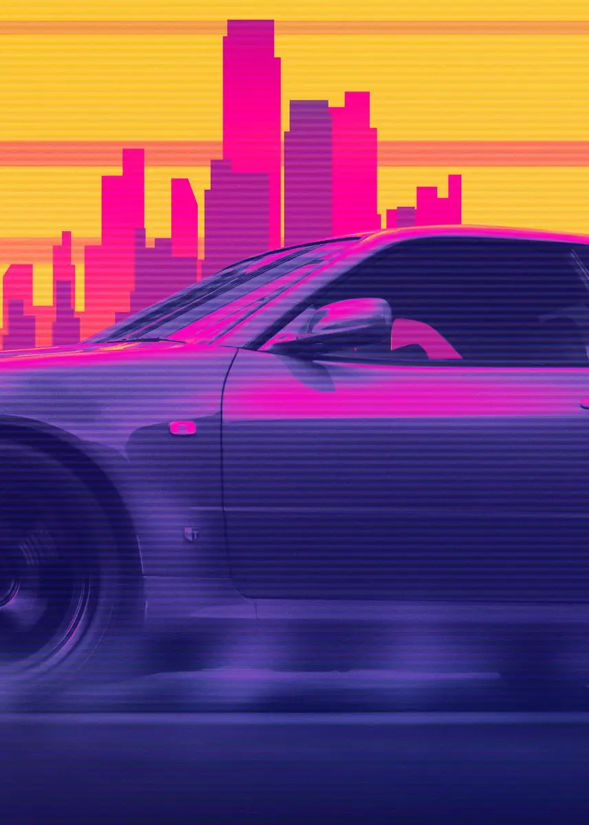 Неоновый постер в стиле Токио для уличных гонок Nissan GTR Synthwav...