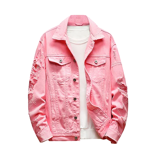Мужская джинсовая куртка, розовая Потертая джинсовая куртка с дырка...