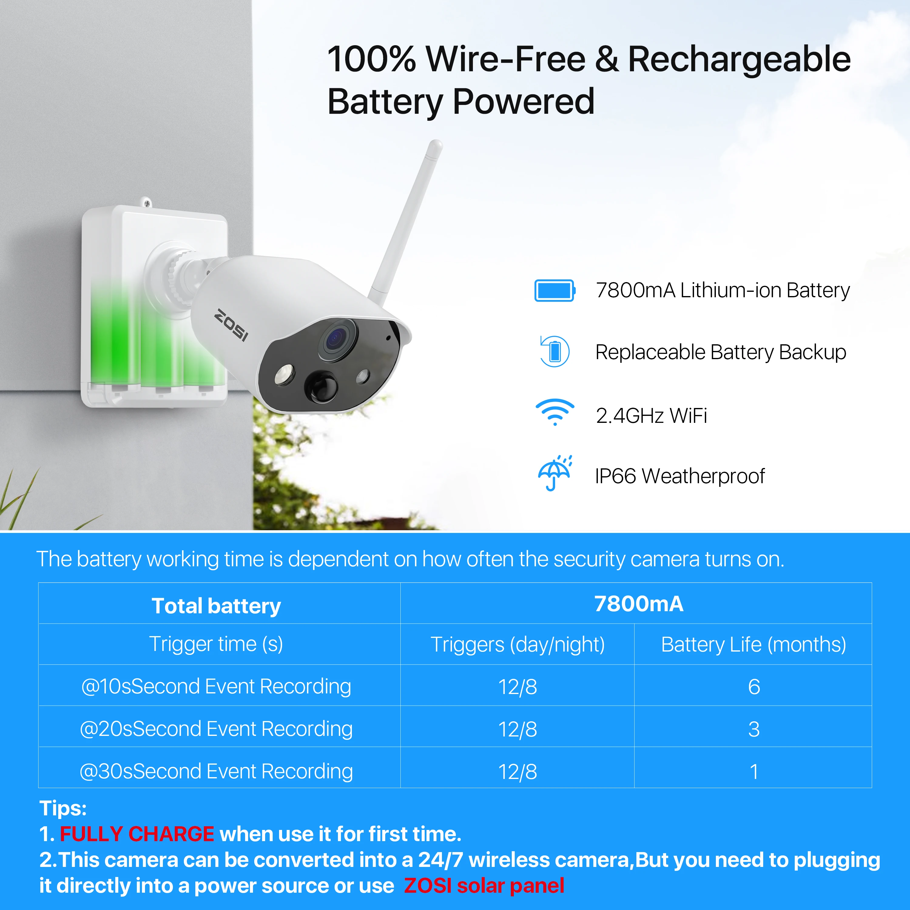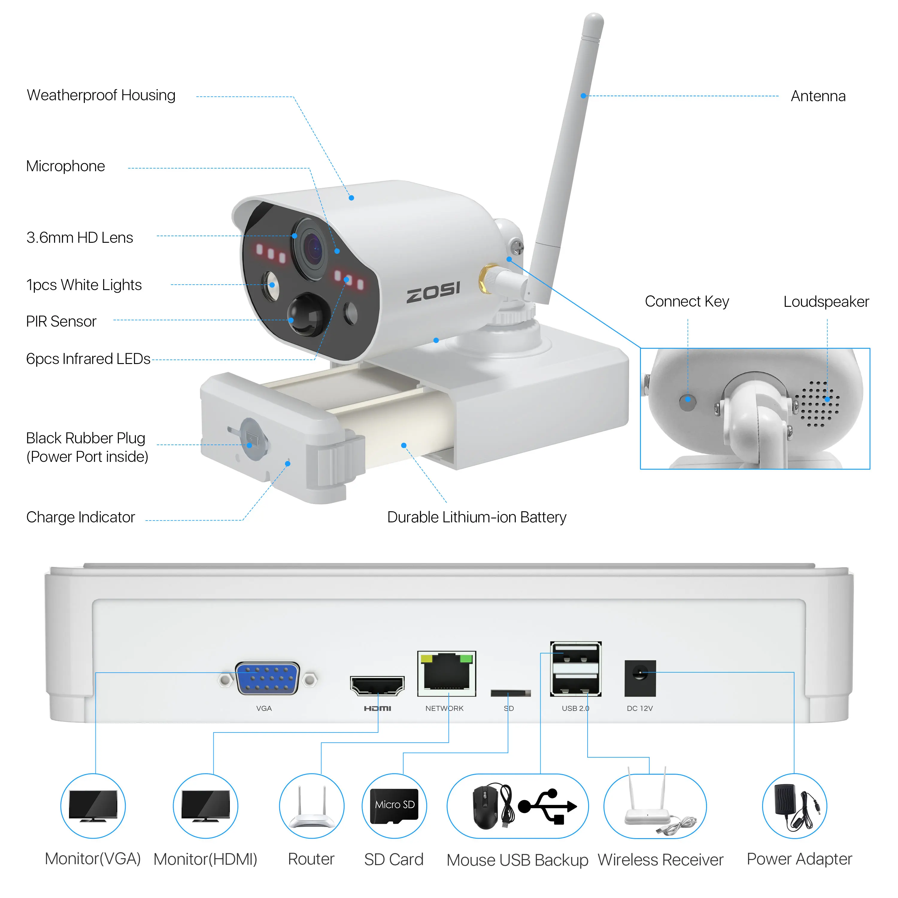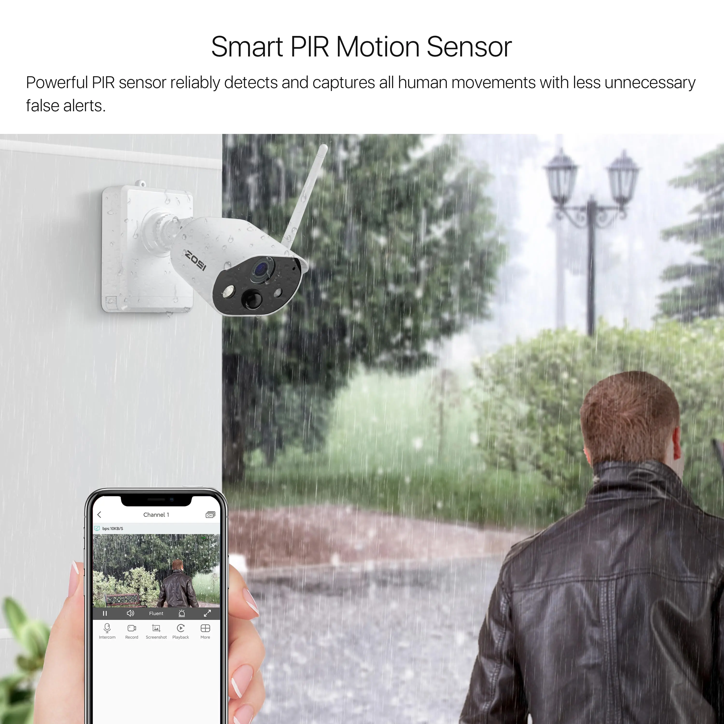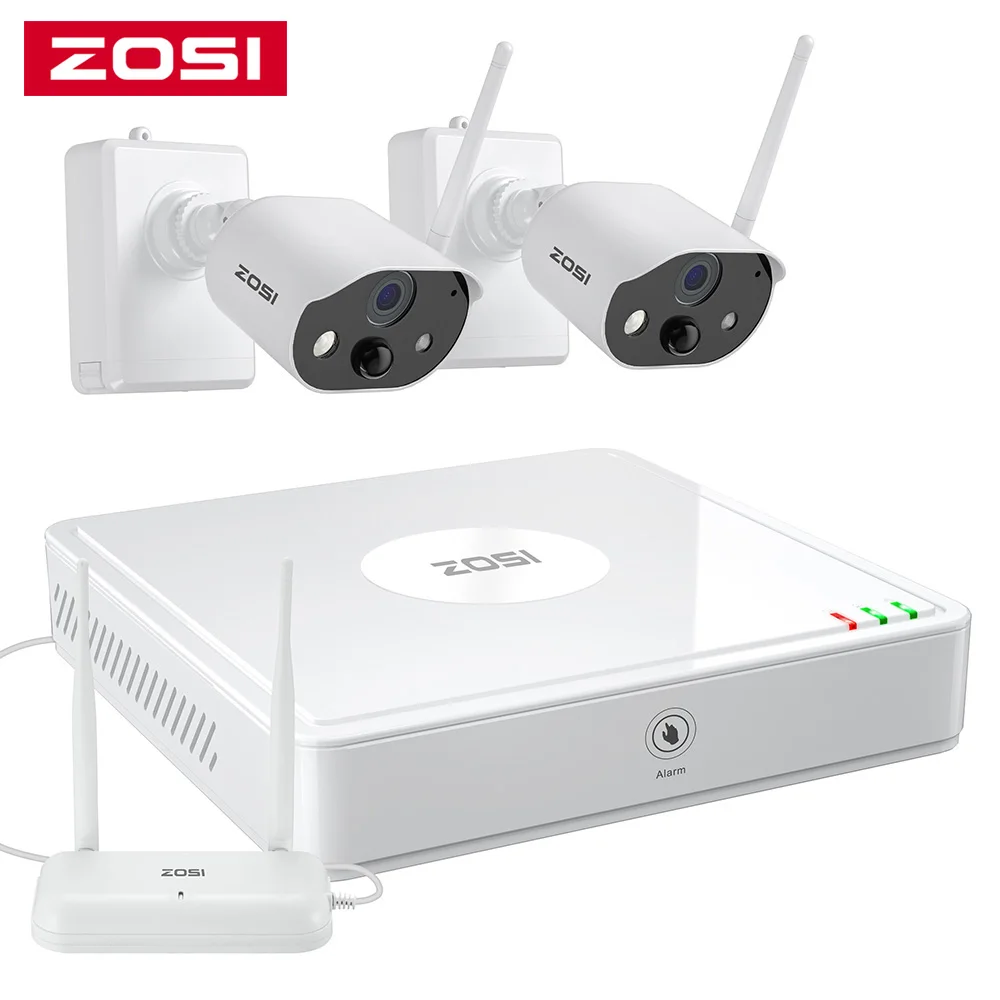 Беспроводная система видеонаблюдения ZOSI, 4-канальный сетевой видеорегистратор, 2 камеры видеонаблюдения с аккумулятором 1080p, карта TF 32 ГБ