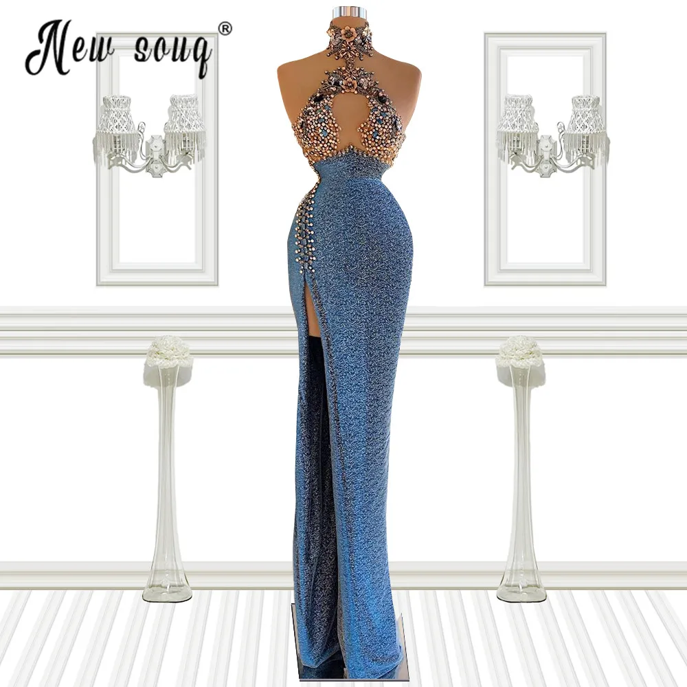 Вечерние платья в африканском стиле с 3D цветами, модное синее платье русалки с открытой спиной и бисером, платье для выпускного вечера с разрезом, вечернее платье с кристаллами