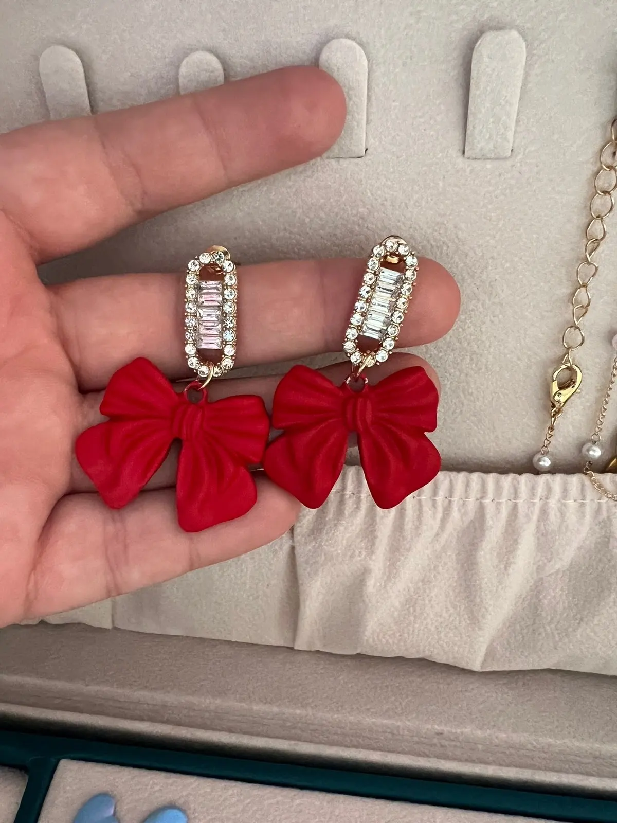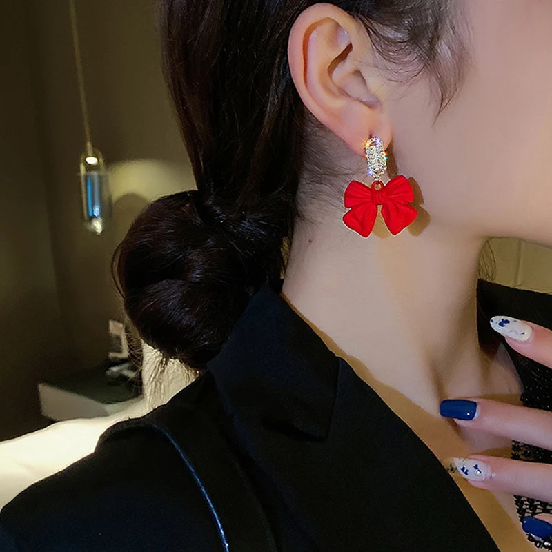 Новые стильные висячие серьги с бантом и кристаллами для женщин, серьги на удачу с красным сердцем из циркония, рождественские и Новогодние украшения для девочек