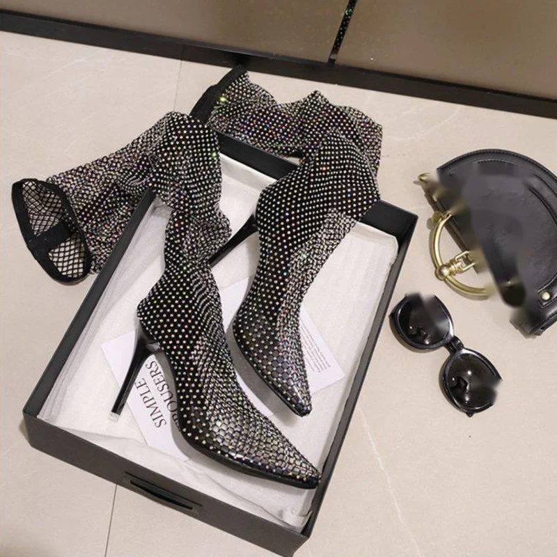 Женские привлекательные сетчатые Сапоги выше колена с острым носком и кристаллами, слипоны на тонком высоком каблуке-шпильке, блестящие современные эластичные туфли-лодочки, лето