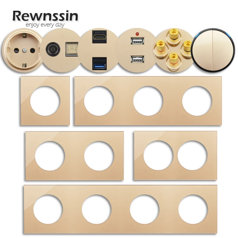 DIY Бесплатная комбинация Роскошная золотая стеклянная панель рамка 1234 кнопочный светильник ключатель света EU FR HDMI USB RJ45 TV Audio Power Socket