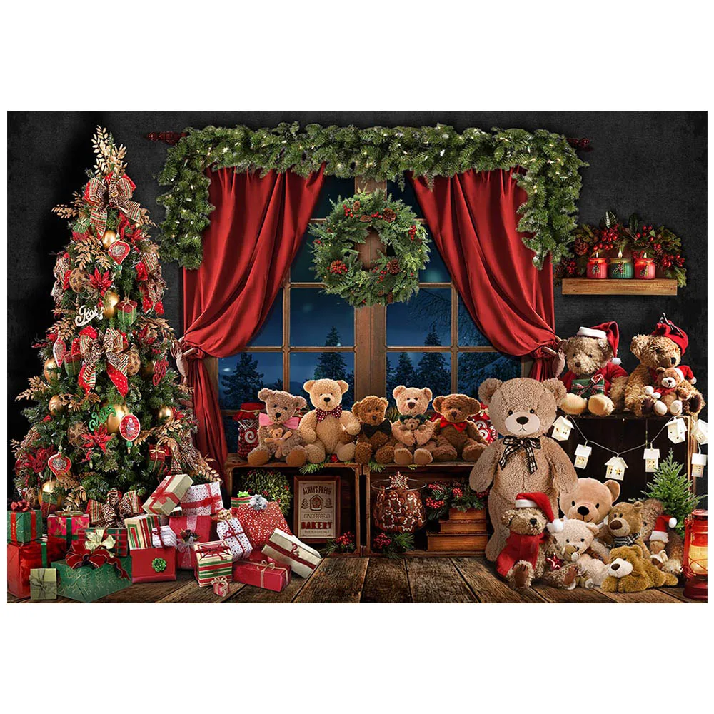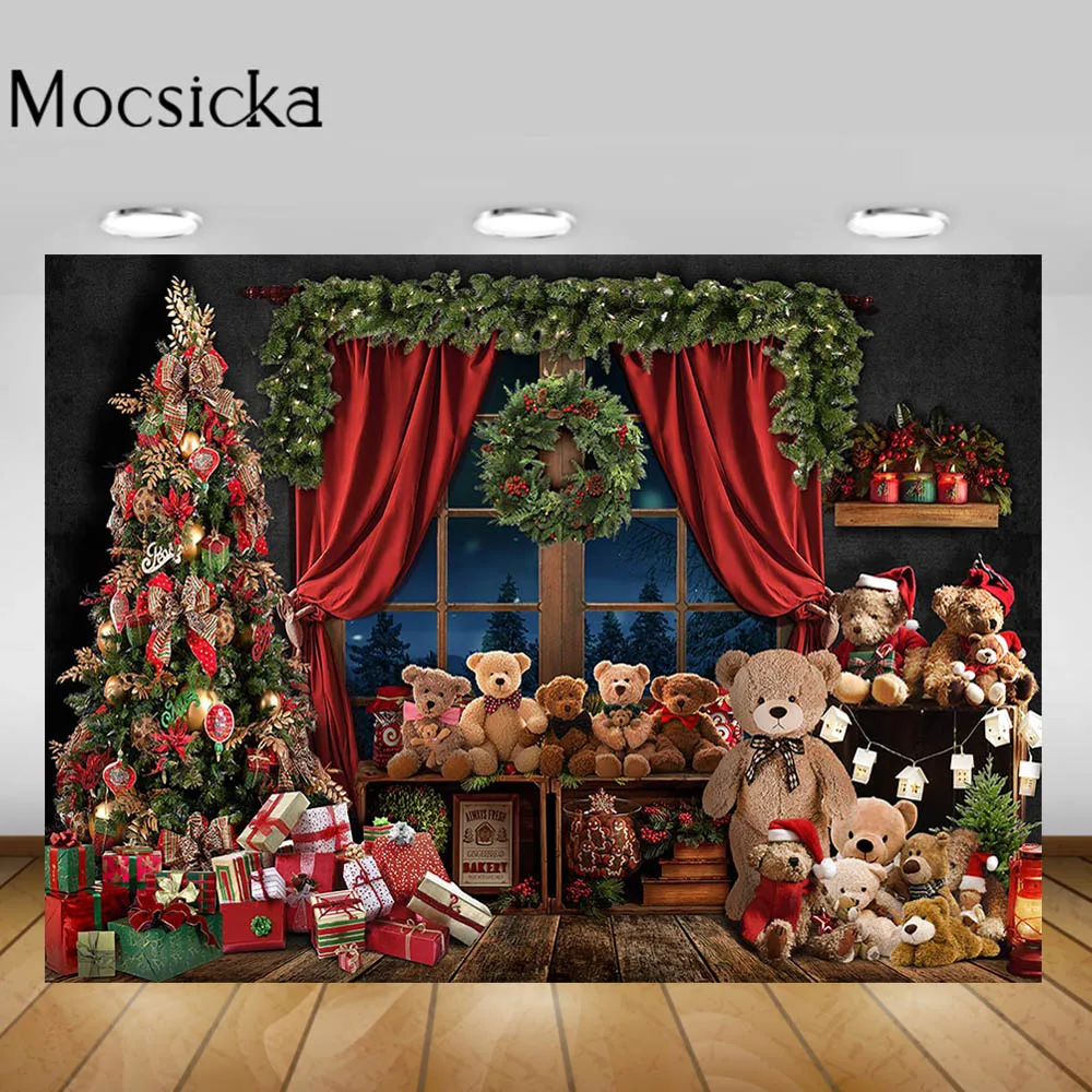 Фон Mocsicka для фотографирования детей с изображением деревянного пола, рождественских игрушек, медвежонка, рождественской елки