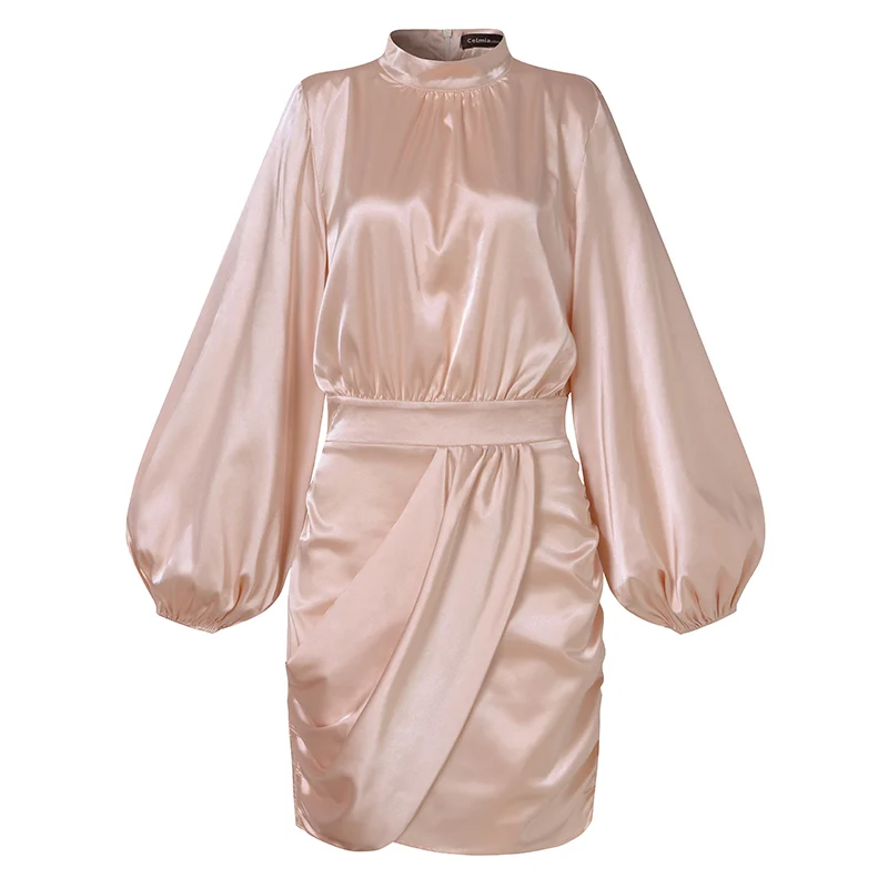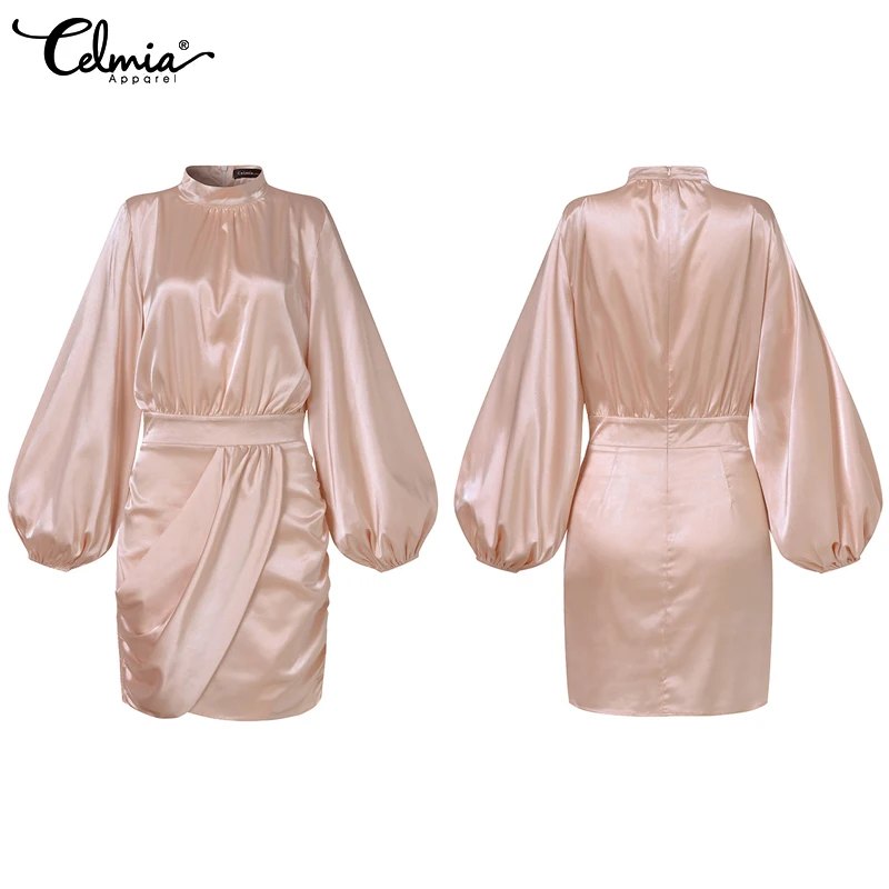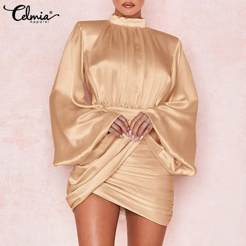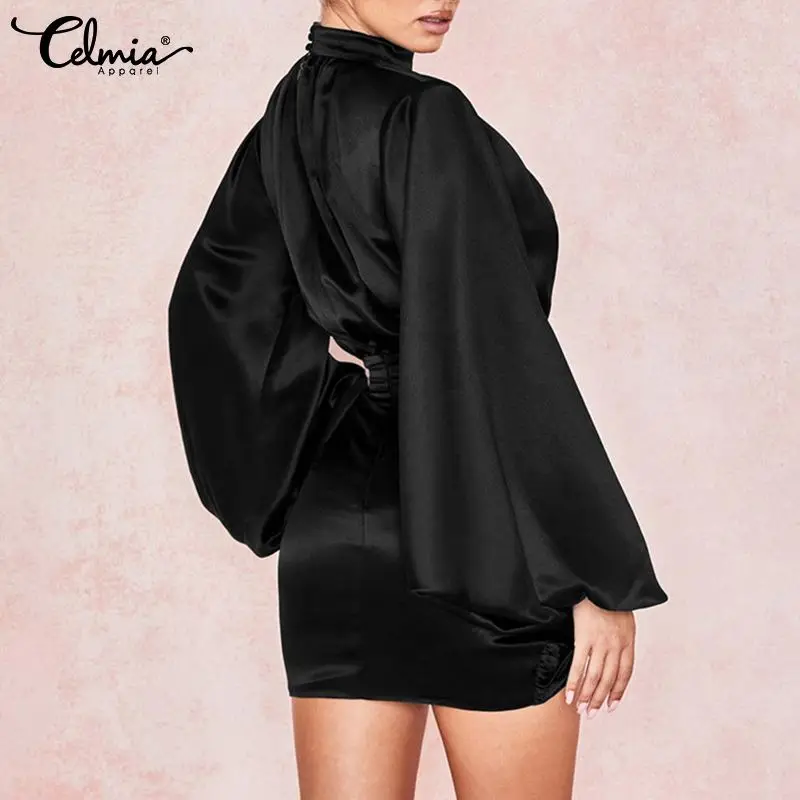 Женское атласное вечернее платье Celmia, новинка 2022, плиссированные мини-платья с воротником-стойкой, пикантные короткие платья с рукавами-фонариками и поясом