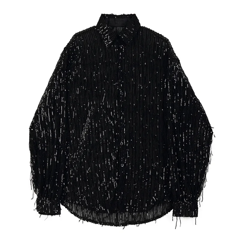 Мужская Просвечивающая Повседневная рубашка с длинным рукавом и кисточками, с блестками, Мужская Ретро мода, уличная одежда, свободные рубашки, одежда для выступлений на сцене