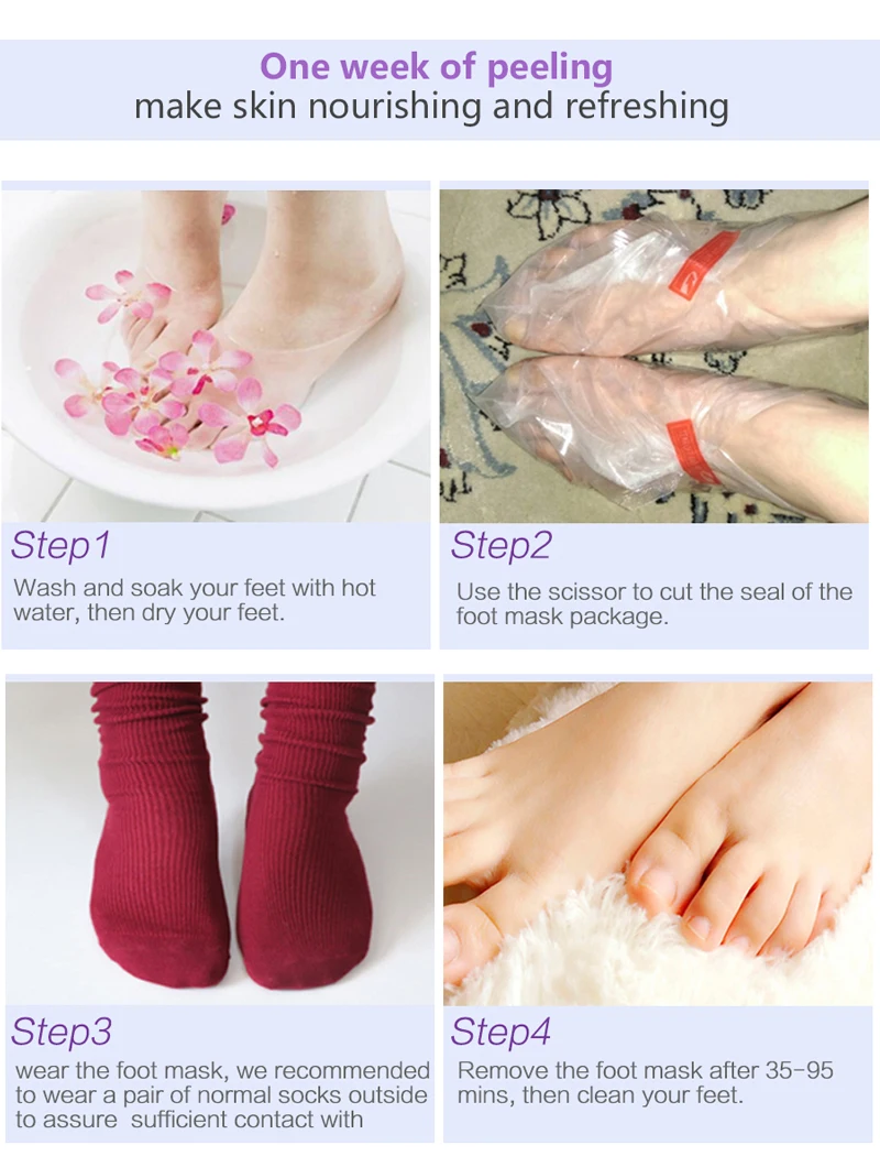 1. Вымойте ноги, замочив их в горячей воде, затем высушите ноги. 2. Используя ножницы, откройте пакет с маской для ног. 3. Наденьте маску для ног, мы рекомендуем надеть пару обычных носков сверху, чтобы обеспечить достаточный контакт с маской для ног после 35-95 минут, а затем очистить ваш образ. 5. У большинства людей мертвая кожа начинает начинать процедуру 2-3 раза. В этом случае из-за разного типа кожи рекомендуем Повторить процедуру 2-3 раза. В этом случае рекомендуем использовать маску для ног через 48 часов. Не используйте маску, если у вас есть незалеченные порезы. 7. Рекомендуем замочить ноги в горячей воде через 48 часов использования.