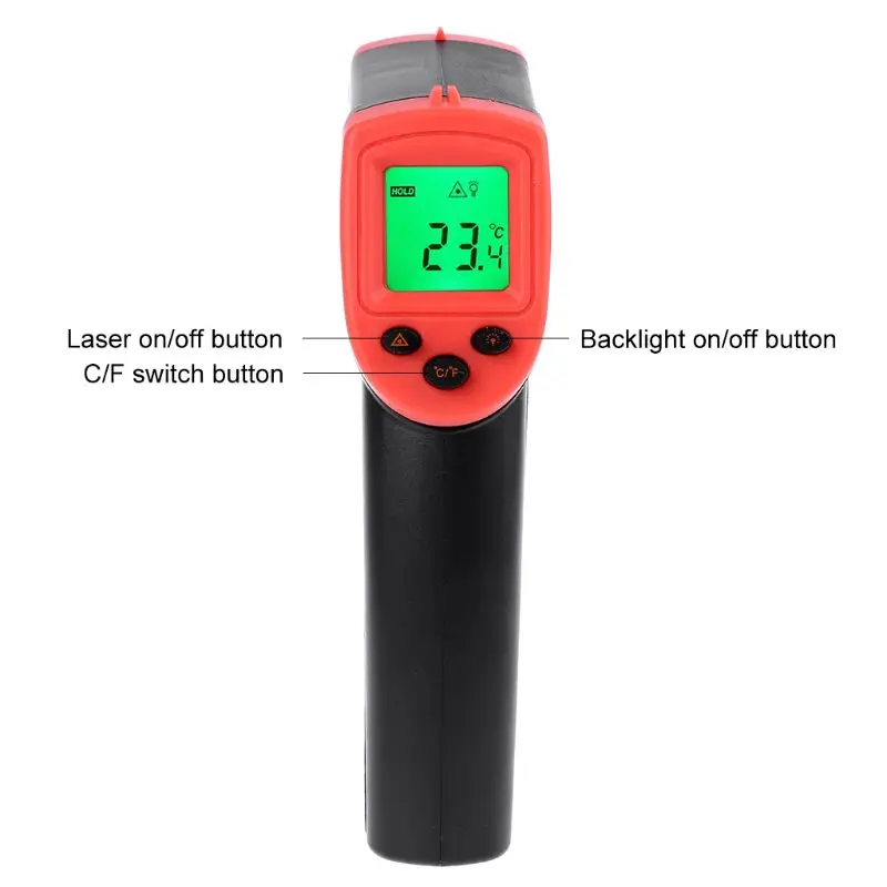 Особенности:100% новый бренд.℃/℉ ВыборФункция удержания данныхЛазерная указка вкл/выкл выборВыбор подсветки ВКЛ/ВЫКЛАвтоматическое отключение питания в течение 7 секунд без каких-либо операцийПродукт используется для измерения температуры поверхности: трубы горячей воды, детали горячего двигателя, кухонные поверхности, горячие трубки и изоляция, электрическое соединение, балласты в электрических огнях... И так далееХарактеристики: