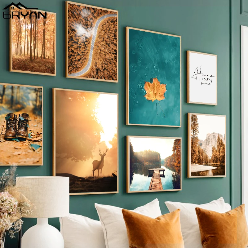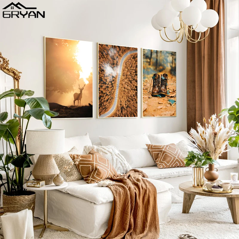 Плакат в скандинавском стиле, осень пейзаж из путешествия, Настенный декор, холст, картина с изображением леса, оленя, шоссе, кленового листа, озера, обуви, современная картина