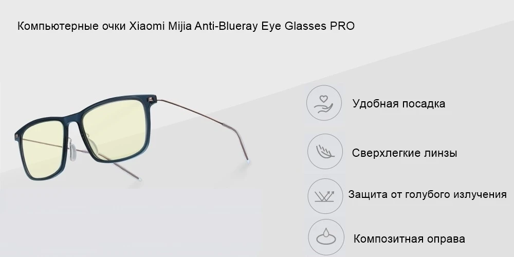 Очки для компьютера Xiaomi MiJia Blu-ray Goggles Pro изготовлены из прочных легких материалов, которые одобрены Управлением по санитарному надзору за качеством пищевых продуктов и медикаментов США (FDA). Для оправы была использована нержавеющая сталь, которая отличается высокой прочностью. Для крепления линз применяются микрофиксаторы, обеспечивающие гибкость конструкции. Подпружиненные петли и 3D-носовые упоры обеспечивают комфортную посадку очков и их правильное расположение.