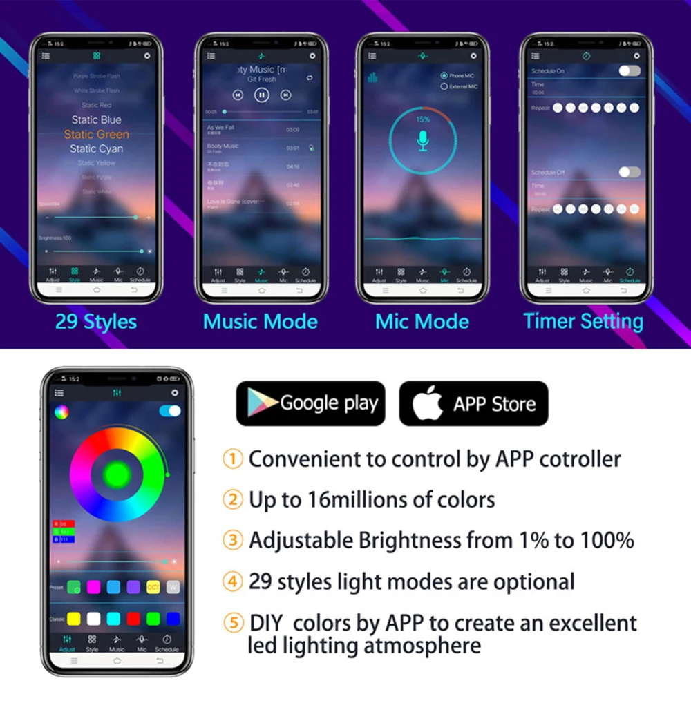 Особенности:1.【APP управление 】управление светодиодными лентами через приложение, пульт дистанционного управления и контроллер. С помощью приложения вы можете свободно контролировать 16 миллионов цветов. Bluetooth-полоска имеет умный режим музыки, который создает романтику, расслабление, атмосферу вечеринки с музыкой, цвет света изменится с музыкальными ритмами или микрофоном.2. 【Диммируемая светодиодная полоска】этот комплект светодиодных лент RGB имеет 300 светодиодов премиум класса с регулятором яркости и яркости. Можно выбрать 28 динамических режимов, таких как мигание, дыхание, стробоскоп, градиент, прохлада и т. Д. Вы также можете сделать свой уникальный цвет, я думаю, это сделает вашу вечеринку более потрясающей. Использование двухслойной меди на печатной плате, чтобы сохранить смешанные цвета более ровными. 3.【 удобный для пользователя 】синхронизация музыки Светодиодная лента имеет функцию памяти. Когда полоски снова используются, они запоминают последние настройки режима без необходимости повторять настройки. Экологичность, экономия денег и отсутствие радиации. Он может быть срезан между каждые 3 бусин, так что вы можете отрегулировать их под нужную длину.4. 【Несколько сцен в наличии 】 он может быть использован для украшения вашей столовой, спальни, наверху, кухни, крыльца, компьютерного стола, рождественской елки, бара и гостиных, особенно отлично подходит для праздников и мероприятий, таких как Рождество, Хэллоуин, вечеринки и многое другое. Это идеальный подарок для вашей семьи и друзей.5. 【Настройка времени 】: настраиваемая функция синхронизации позволяет выбрать, когда и в какие дни вы хотите включить/выключить свет. Вы никогда не будете беспокоиться о том, если вы забудете выключить свет или нет, установите время для ваших веревочных огней, когда вы просыпаетесь по утрам, чтобы осветить ваш чудесный день.6. 【Легкость installation】Fully оснащен аксессуары, он поставляется с 1 Катушка светодиодные полосы света, вluetooth контроллер, 24-кнопочный ИК-пульт дистанционного управления, нет необходимости в какой-либо другой дорогие устройства. Легко устанавливается, просто очистите клейкую поверхность и Наклейте, никаких дополнительных шагов. Наше приложение продолжает обновление, чтобы сделать его совместимым с более интеллектуальными устройствами. (Поддерживает IOS 8,0 или выше/Android 4,3 или выше)Спецификация:-Тип: мягкие гибкие RGB светодиодные неоновые гирлянды-Входное напряжение: 12 В постоянного тока-Цвет излучения: RGB-Тип СВЕТОДИОДА: SMD 3535-Количество светодиодов: 96 светодиодов/м-Мощность: 7-9 Вт/м-Размер ленты: 6 мм x 12 мм-Степень водонепроницаемости: IP67-Угол луча: 180 градусов-Удаленное Расстояние приложения: Макс 30 м-Можно резать каждые 3 светодиода (на разрезаемой маркировке)Пожалуйста, обратите внимание:6 м = 1 м + 5 м7 м = 2 м + 5 м8 м = 3 м + 5 м9 м = 4 м + 5 м10 м = 5 м + 5 мАдаптер питания для выбора:-0,5 м/1 м: используется источник питания 12 в 1 А-2 м: Используйте источник питания 12 В 2 А-3 м: используется источник питания 12 В 3 А-4 м/5 м/6 М: Используйте источник питания 12 В 5 А-7 м: используется источник питания 12 В 6 А-8m/9m/10m: Используйте 12V 8A powe питанияВнимание:1, bluetooth-контроллер Установите соединение, пожалуйста, загрузите приложение сначала, затем подключите Bluetooth из приложения, не нужно искать bluetooth устройство через ваш телефон bluetooth настройки.2, пульт дистанци