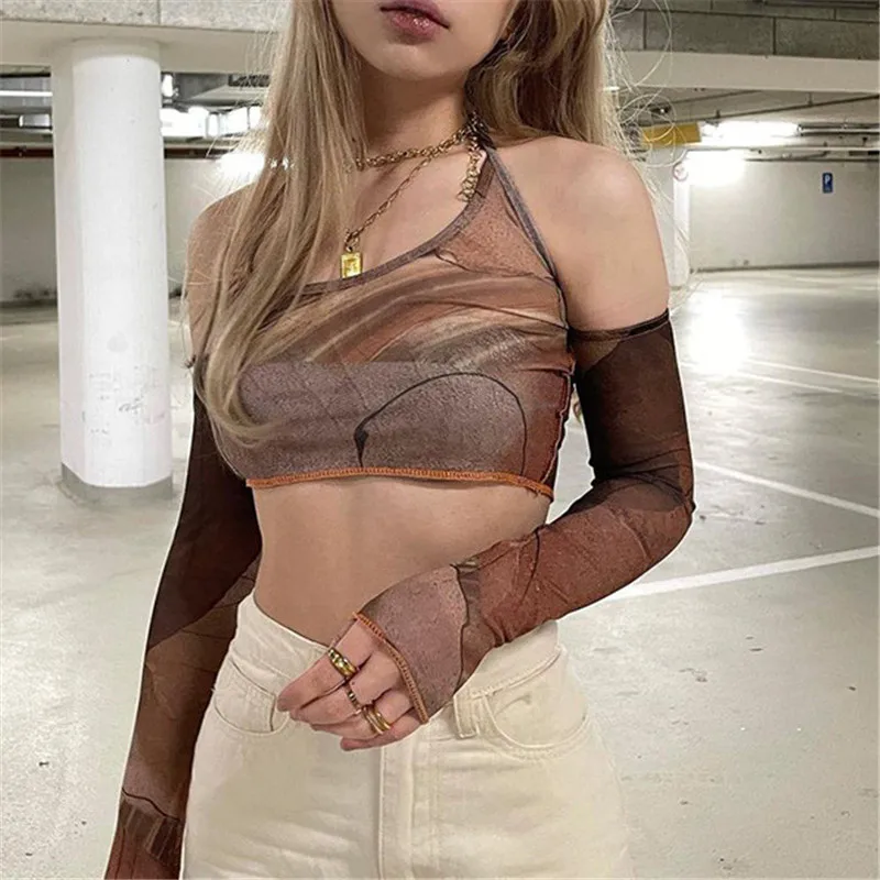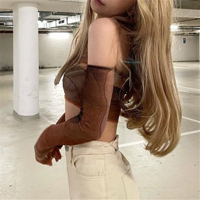 Коричневый корсет с принтом, топ y2k, гранж, винтажный укороченный топ с перчатками, модная толстовка, женский летний топ, футболка в Корейском стиле, новинка 2021