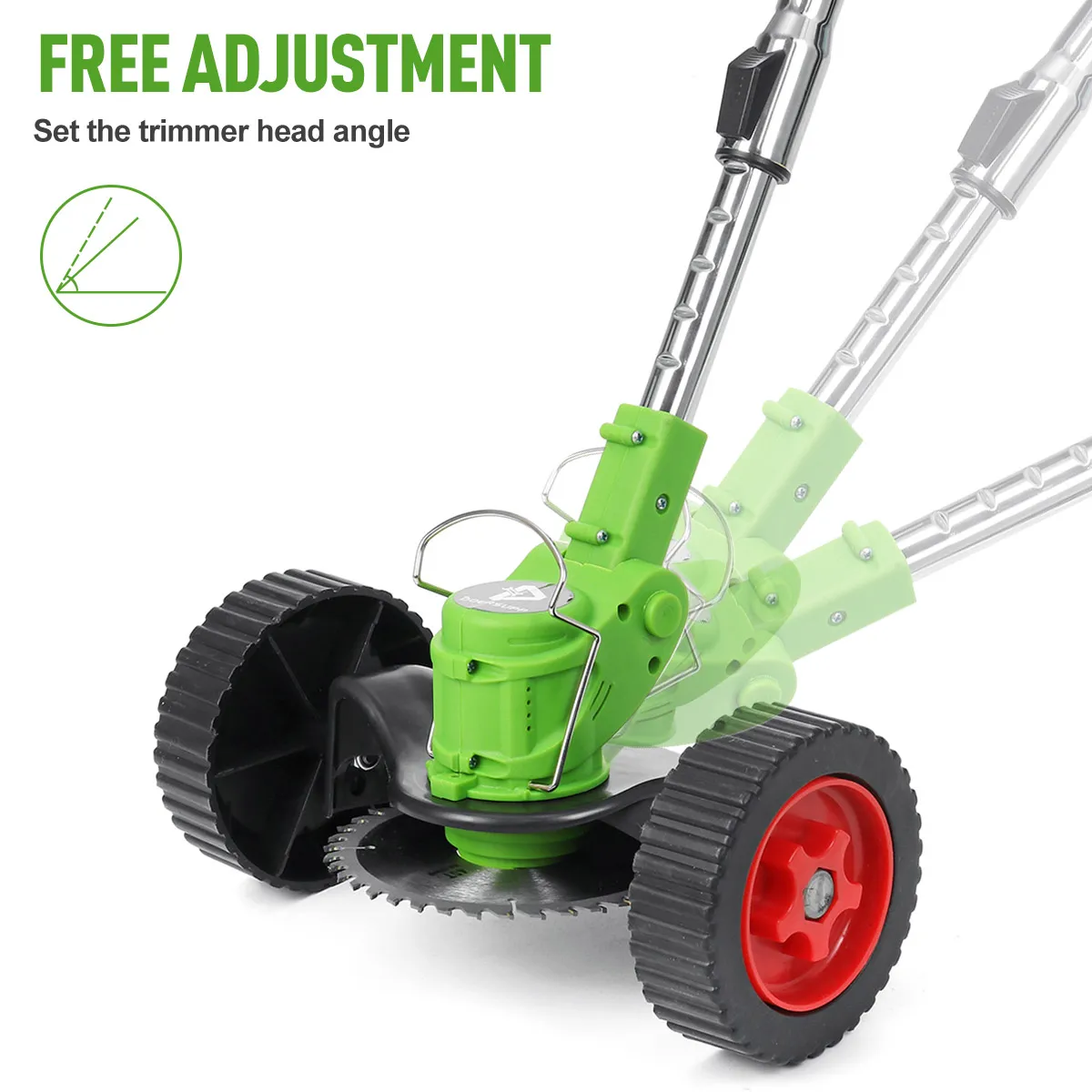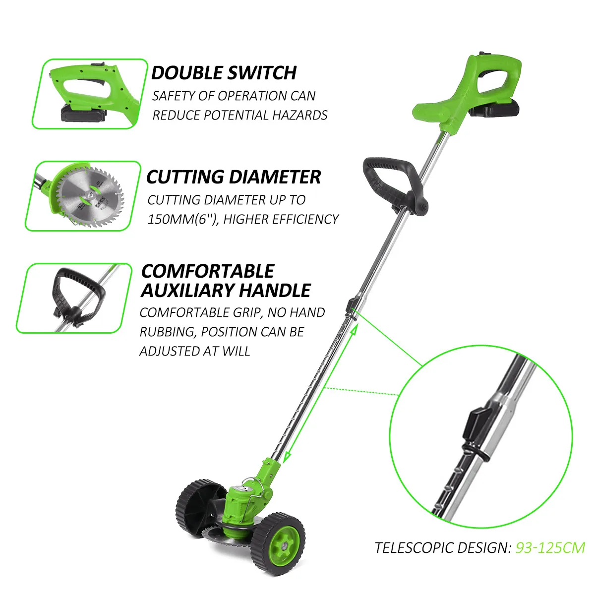 Особенности:-Двигатель из чистой меди, высокая мощность, быстрая скорость.-Провод для предотвращения столкновений, лезвие защитной рамы никогда не прикасается к твердым предметам.-Регулируемая головка машины, без мертвого угла.-Водонепроницаемый Чехол, не легко просачиваться в дождь или розу во время использования.-Диаметр резки, диаметр резки до 150 мм, высокая эффективность.-Удобная вспомогательная ручка, удобная ручка, без ручного трения, положение можно регулировать по желанию.-Двойное переднее колесо, более удобное для работы в течение длительного времени.-Двойная ручка переключателя управления, более удобная работа, высокий коэффициент безопасности.-Светодиодный дисплей батареи, легко понять оставшуюся емкость аккумулятора и контролировать нагрузку.-16-раздел полюс может быть отрегулировано по своему желанию, со степенью расширения 1-33 см, а высота может быть отрегулировано по своему желанию в соответствии с потребностями.