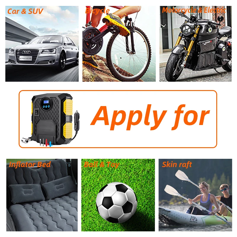 Этот воздушный компрессор позволяет надуть стандартную автомобильную шину среднего размера от 0 ~ 36PSI (0-248KPA) всего за 4-6 минут.Это делает надувание низких и плоских шин в аварийной ситуации проще и удобнее. Манометр дисплей блока воздушного компрессора: PSI, бар, кПа, кгс/см2.До 3 метров 12В автомобильный шнур питания, может эффективно обеспечивает эксплуатацию изделия радиус, нажмите на кнопку, чтобы зарядить сразу без затягивания.Встроенный разъем для хранения кабеля и разъем для хранения шлангов, не нужно беспокоиться, что шнур слишком длинный, чтобы положить, более удобный в использовании.Со встроенным светодиодный светильник, вы не будете иметь проблем с видением того, что вы делаете с шиной, даже когда вы работаете в темном гараже, припаркован под сломанный уличный светильник, или сломался рядом с неосвещенной сельской дорогой.Отлично подходит для многих типов шин: автомобилей, велосипедов, мотоциклов, RV, SUV, ATV, резиновых кораблей, а также спортивного оборудования и надувных изделий. Три дополнительных насадки и адаптеры, которые входят в комплект, делают компрессор универсальным и более широко используемым.