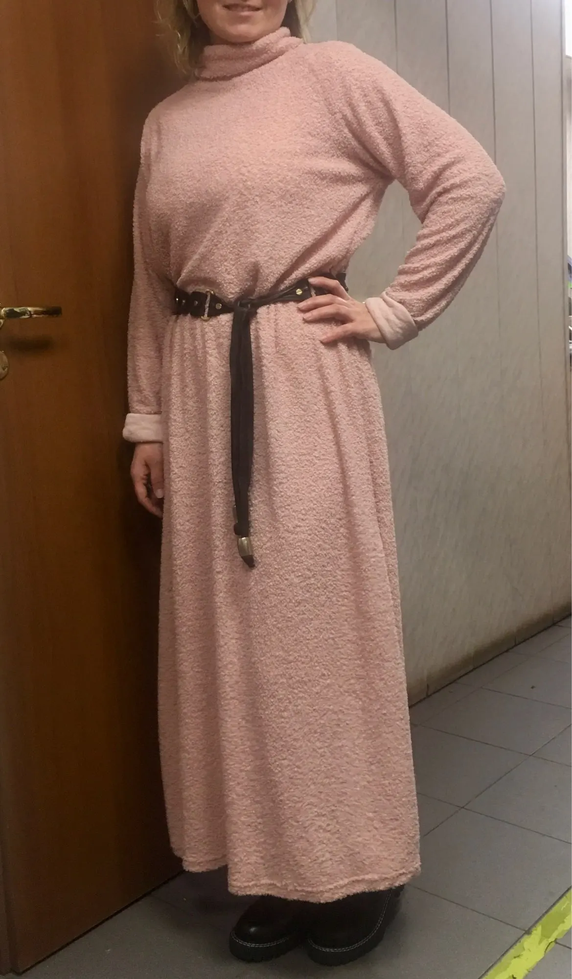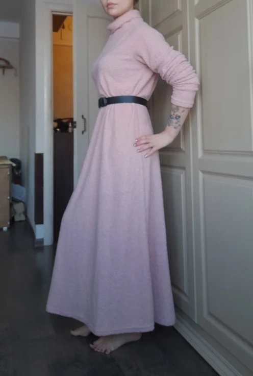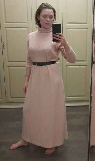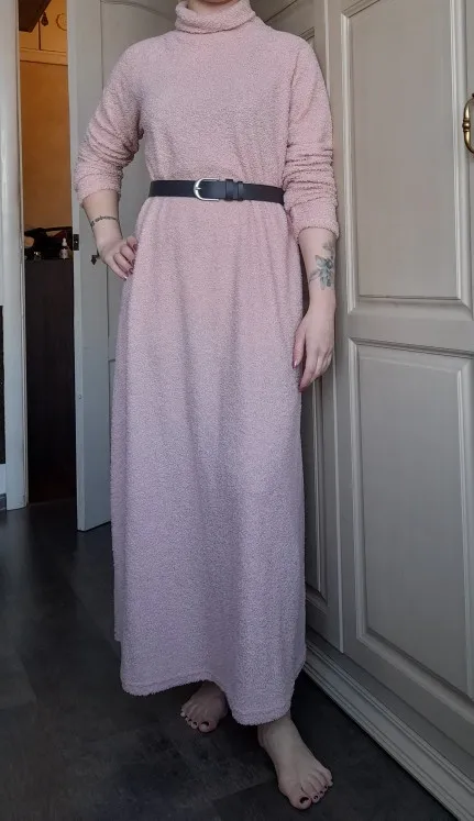 Я довольна! Отличное базовое платьице на зиму. На рост 170 см практически до пола, но с поясом самое то. Рукава длинные, я подворачиваю, но можно подшить. Больше не меньше :-))) Объёмы 105-75-106 см, в меру свободное. Качество нормальное, ткань букле, довольно тонкая, но тёпленькая, к хлопковым колготкам не липнет и совсем не мнётся. В Москву шло недели две, получила в Пятёрочке. Только сложено было в пакете неаккуратно, как будто его доставали и сложили в спешке, но это может быть из-за ткани, она очень мягкая.