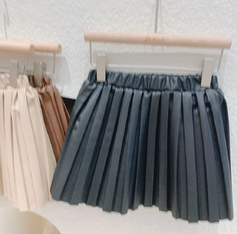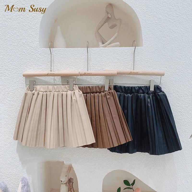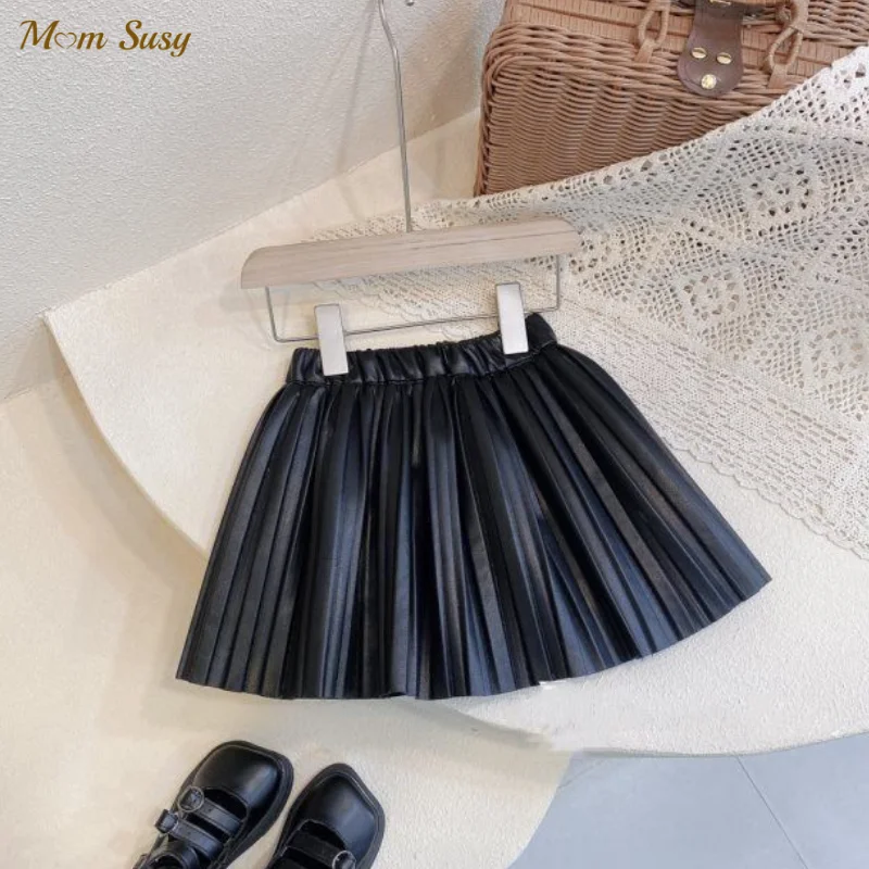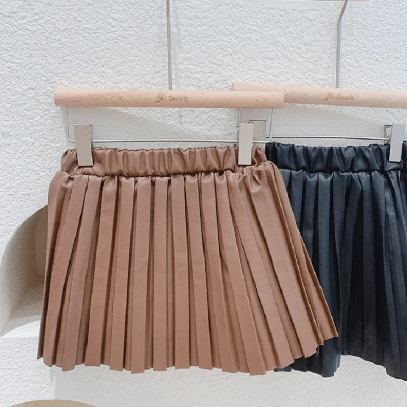 Модная плиссированная юбка из искусственной кожи для маленьких девочек, демисезонная и Зимняя юбка из искусственной кожи, черная, коричневая, хаки, Детская короткая одежда
