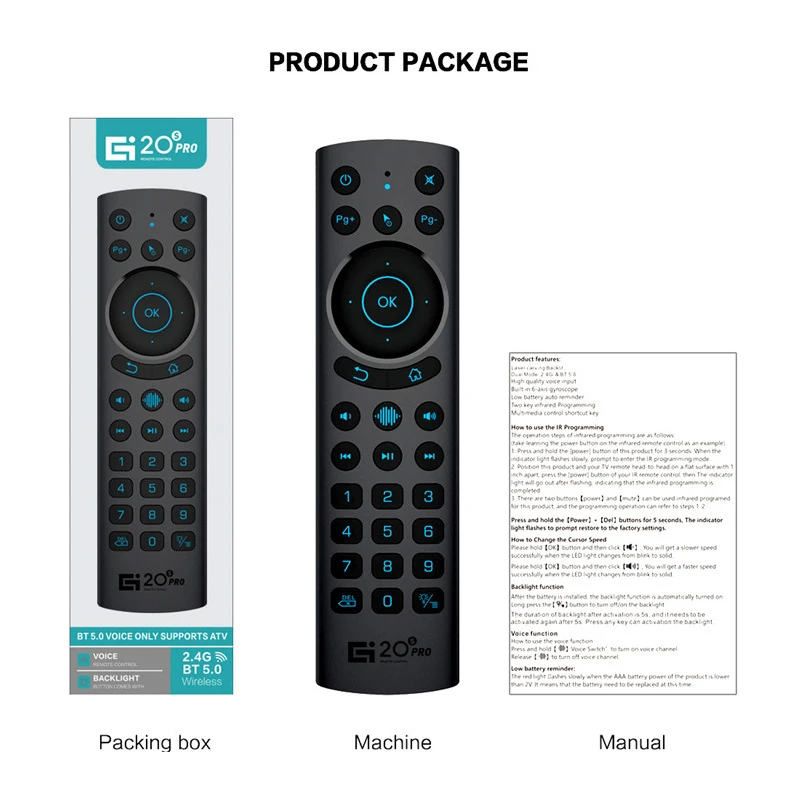 G20BTS Plus основные функции:1) вставной usb-ключ может работать в BT5.0/2,4G беспроводной гироскоп функция, нетUSB ключ может работать только с BT5.02) подключи и работай3) Функция Air mouse4) функция голосового управления5) функция инфракрасного обучения (вы можете узнать его через кнопку «Питание»)6) кнопки подсветки