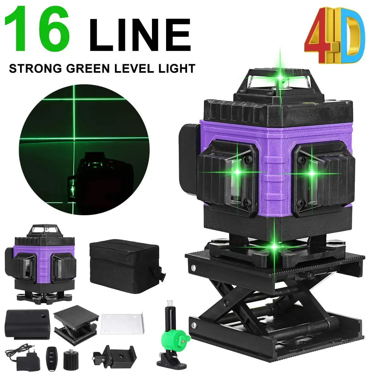 16 линий 360 ° Горизонтальный Вертикальный крест 4D зеленый светильник лазерный уровень самонивелирующийся супер мощный лазерный луч