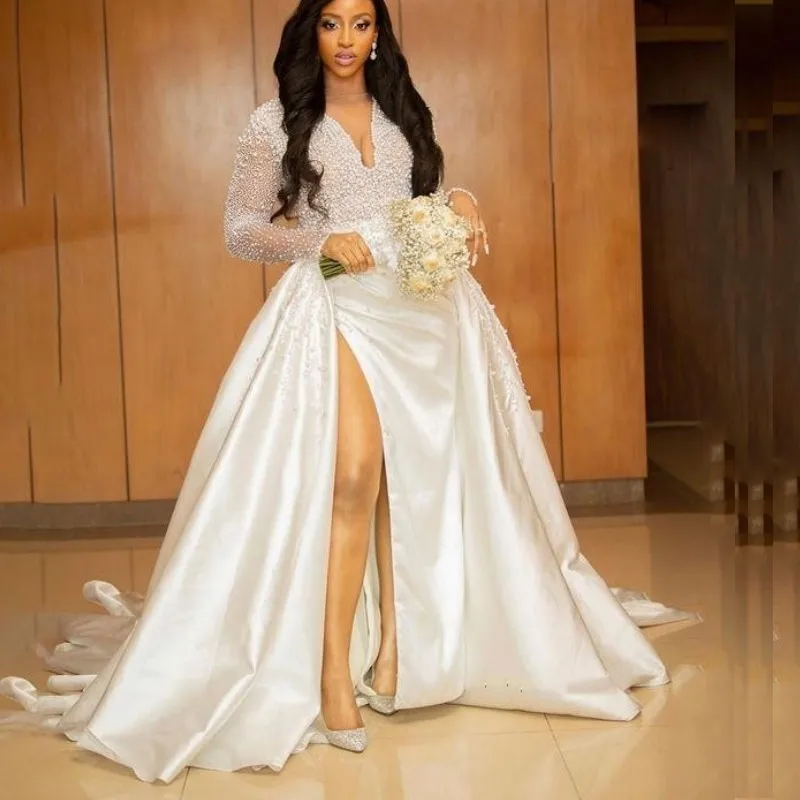 Роскошные большие жемчужные нарукавники Свадебные платья Aso Ebi прозрачный вырез vestido de noiva с длинным рукавом с высоким разрезом