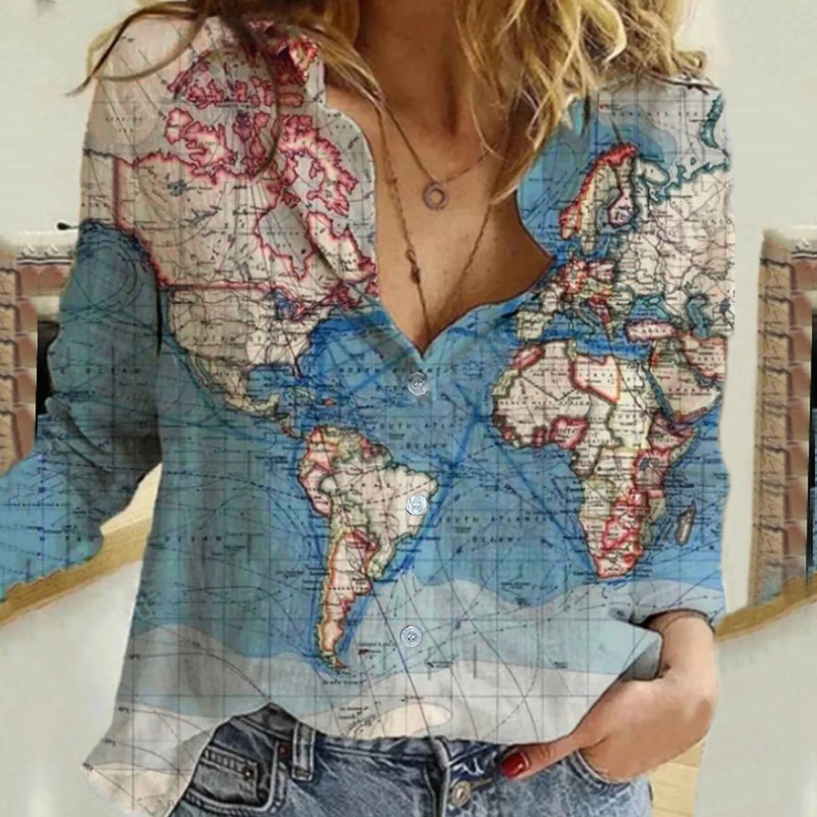 Женская рубашка на пуговицах с отложным воротником, Свободный Повседневный топ с длинными рукавами и принтом карты мира