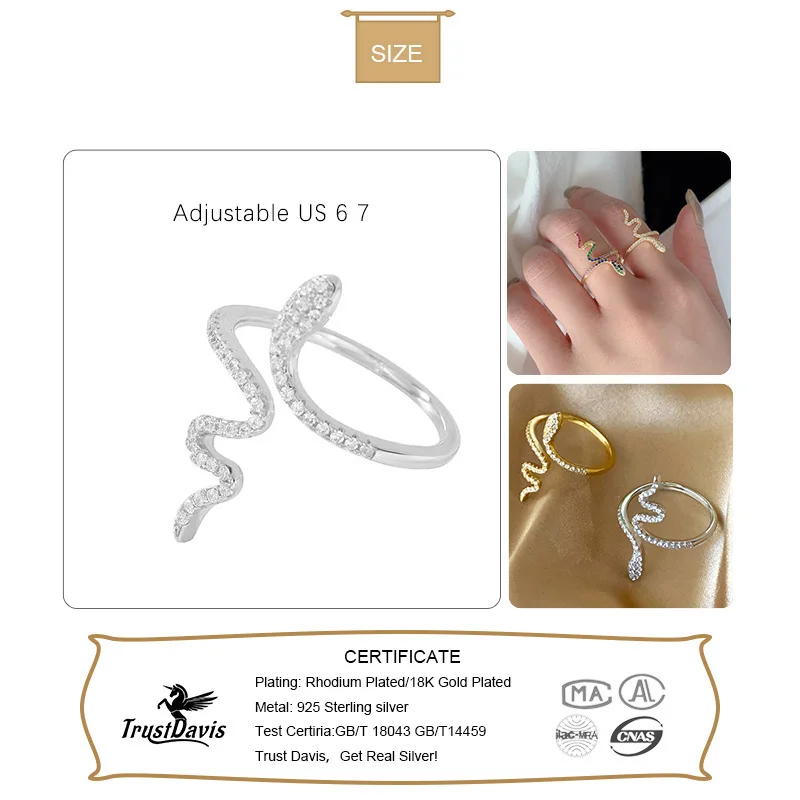 Женское кольцо со змеей TrustDavis, открытое из серебра 925 пробы, сверкающий Циркон пробы, для свадебной вечеринки, ювелирные украшения из драгоценных камней, DA2434