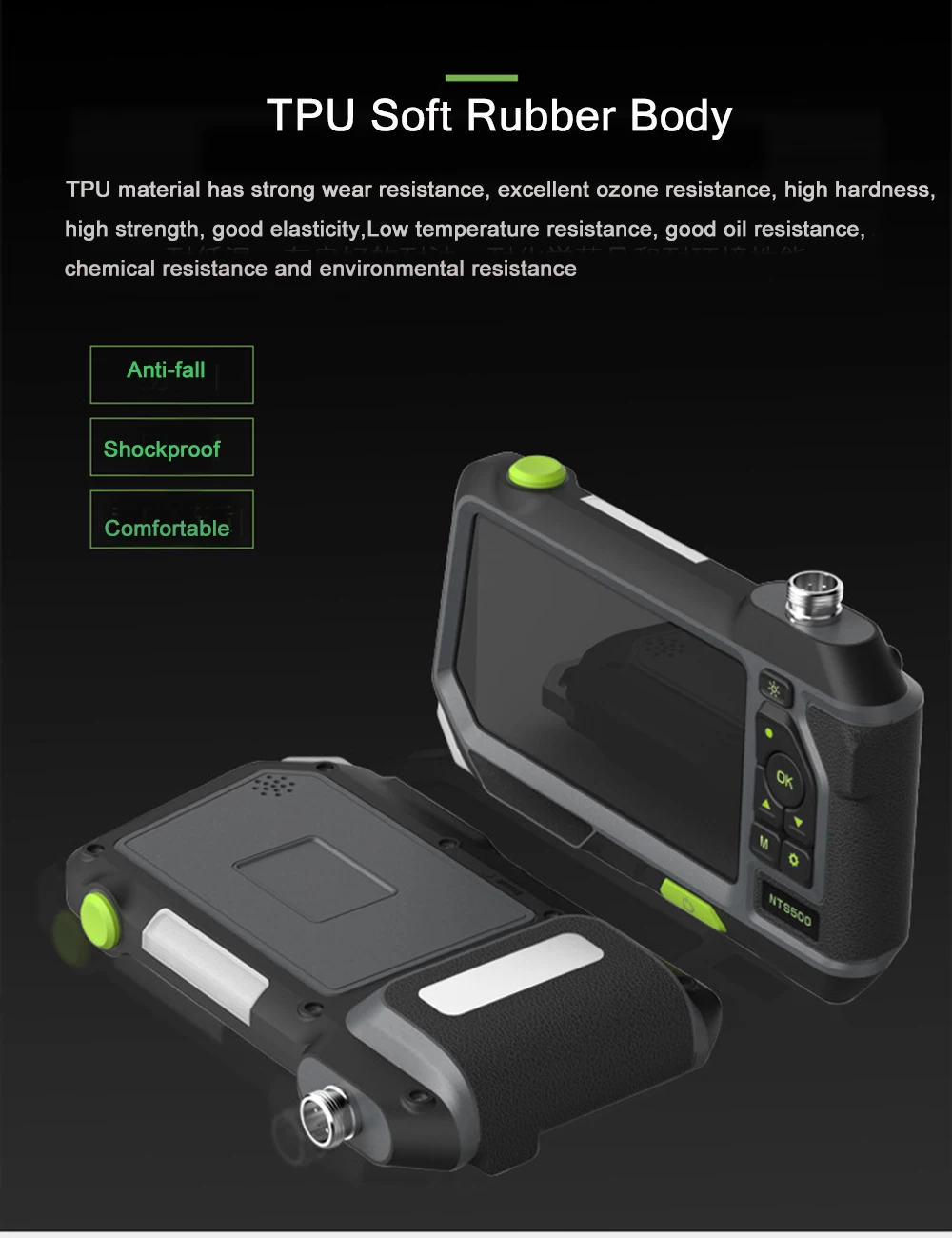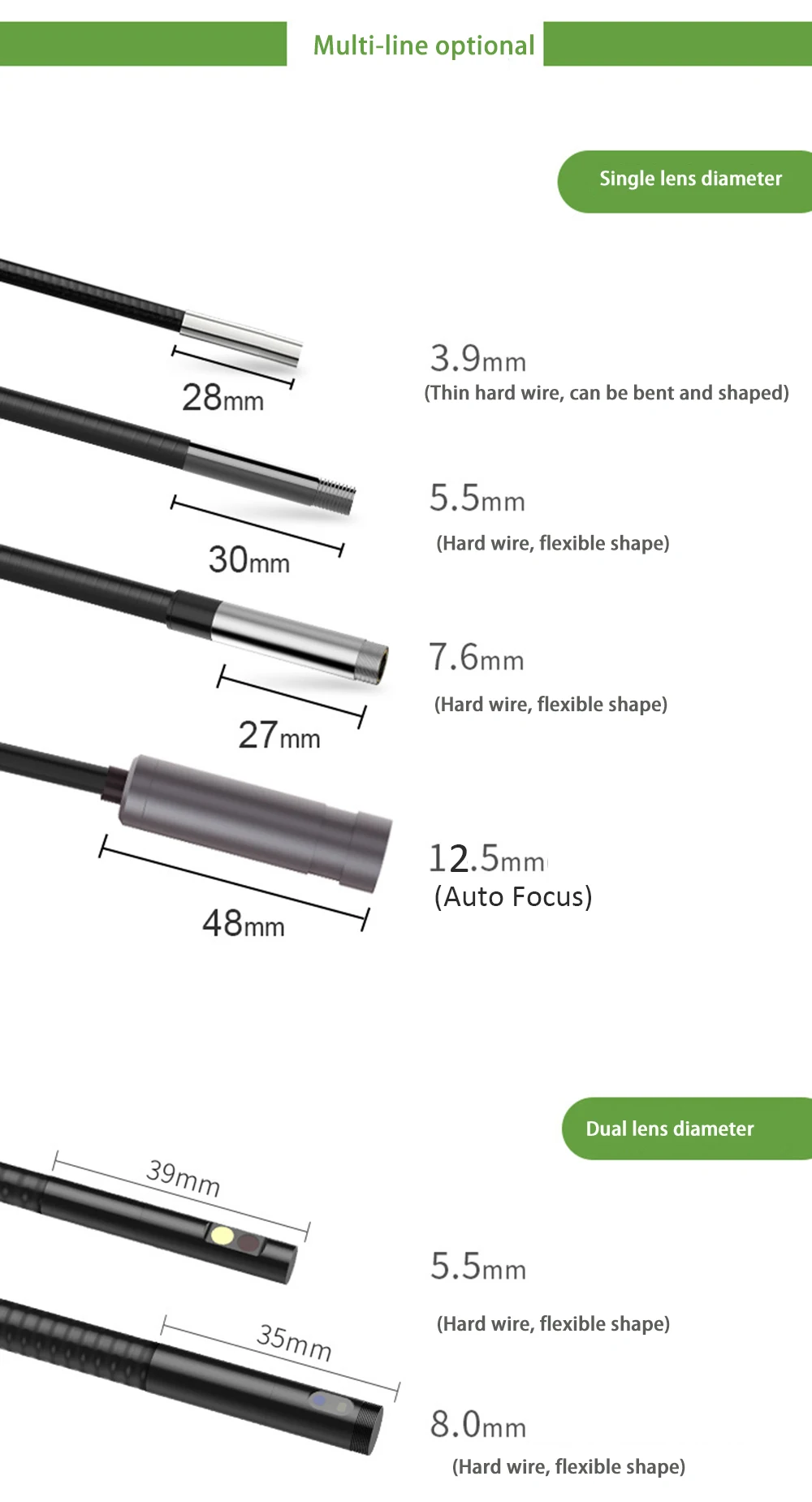 Монитор:Тип экрана: 5,0 дюймов Размер Цвет экранРазрешение: 1920*1080 пикселей (QVGA)Вращение: 360 °Разрешение камеры: 1920*1080Разрешение фото: 1920*1080Разрешение записи: 1280*720Язык: английский. Китайский, немецкий, французский, испанский, итальянский, русский, японскийПорт: Порт удаленного подключения, USB, слот для tf-карты32G TF SD картаКамера:Диаметр: 12,5 мм объективДиаметр вала: 7 ммДлина вала: 100 см/300 см/(полу-жесткий кабель)Разрешение: 2,0 мегапикселейУгол обзора: 70 °Глубина поля: 30 мм-60 ммСветильник источник света: 6 Регулируемых светодиодов высокой интенсивностиПрочее:Светодиодный светильник вспышки: 1 Вт CREE светодиодныйРабочая температура: от 32 до 113 °F (от 0 до 45 °C)Мощность: 3500 мАч литиевая батарея (в комплекте)Срок службы батареи: 4-5 часовСертификат: CE FCC ROHS