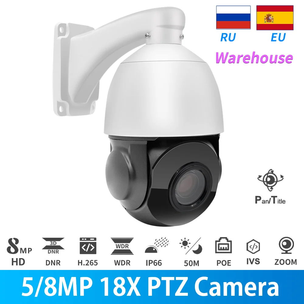5/8MP 18X PTZ сетевая камера 5 Мп: 1/2.8 ”5 Мп CMOS 8 Мп: 1/2.8 ”8 Мп CMOS Мощный 18X оптический зум, цифровой зум 30X WDR, день/ночь (ICR), DNR 5 Мп: Макс. 20fps 5MP / 30fps 4MP 8 Мп: Макс. 20fps 8MP / 30fps 6MP Диапазон панорамирования: от 0 до 355, Диапазон наклона: от 0 до 90 Поддержка PoE Совместимость: HIKVISION,ONVIF IP66