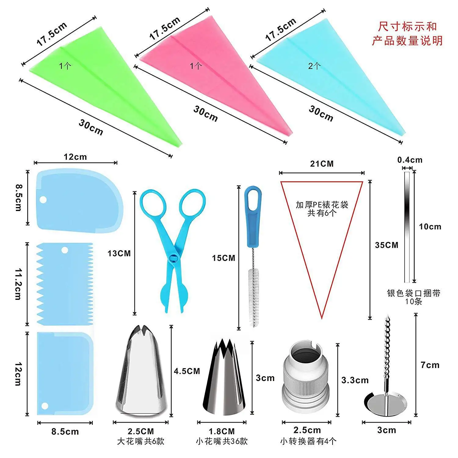 1) 36 носик для украшения из нержавеющей стали (маленький)2) 6 носик для украшения из нержавеющей стали (большой)3) 1 Шелковый цветок ножницы4) 4 цветочных мешка EVA5) 6 утолщенной цветы из материала PE мешок6) 10 серебряных сумок с ремешками7) 3 крема скребок8) 4 небольших конвертера9) 1 цветочный гвоздь10)1 чистящая щетка