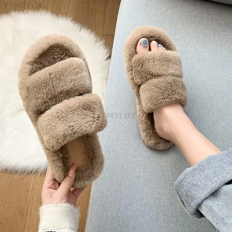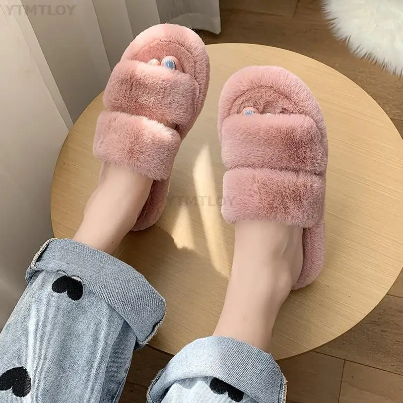 Женские меховые тапочки из флока, модные плюшевые туфли на плоской подошве, роскошная прорезиненная обувь 2022, зимние домашние туфли на плоской подошве
