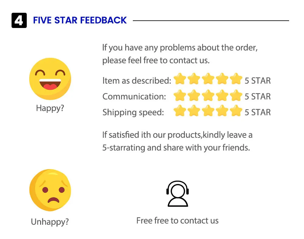 1) Мы всегда будем делать все возможное, чтобы обслуживать и всегда предоставлять лучшее качество продукции каждому клиенту, если вы удовлетворяете Благодаря нашему сервису, нашим товарам, пожалуйста, не стесняйтесь оставить нам положительный отзыв 2) Если у вас есть вопросы об услугах или продуктах, пожалуйста, свяжитесь с нами, мы будем искренне рады удовлетворить вас, это наш Ответственность, просто не оставляйте негативные отзывы, не связавшись с нами. Спасибо.