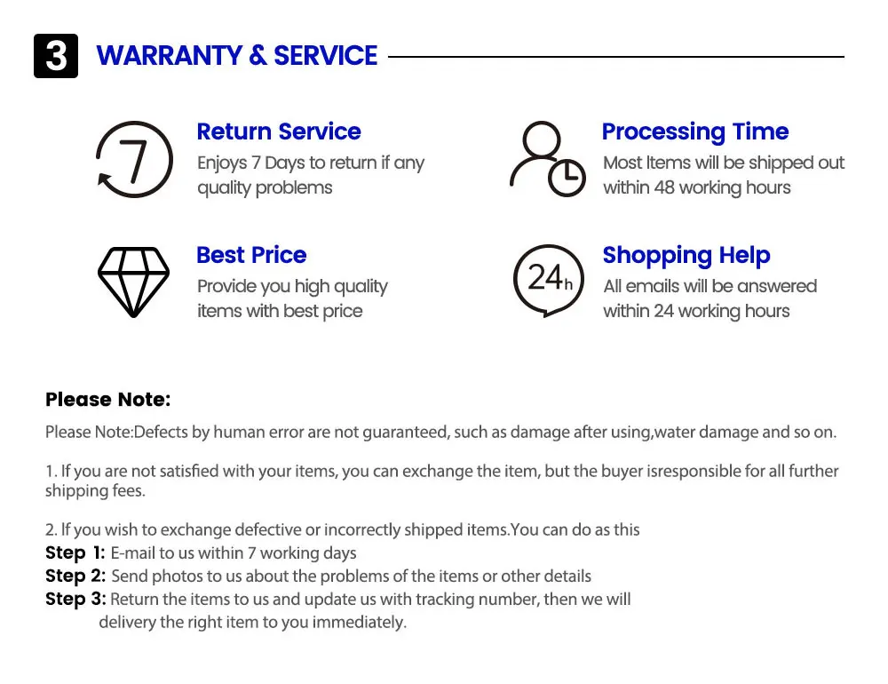 1) Заказы обрабатываются своевременно после проверки оплаты, как обычно, для нас стоимость 24 часов, чтобы получить зарплату. 2) Ваш заказ должен соответствовать вашему адресу доставки, нам нужен ваш правильный номер телефона.Убедитесь, что товары, которые вы получите. 3) после отправки, мы будем отслеживать товары для вас.