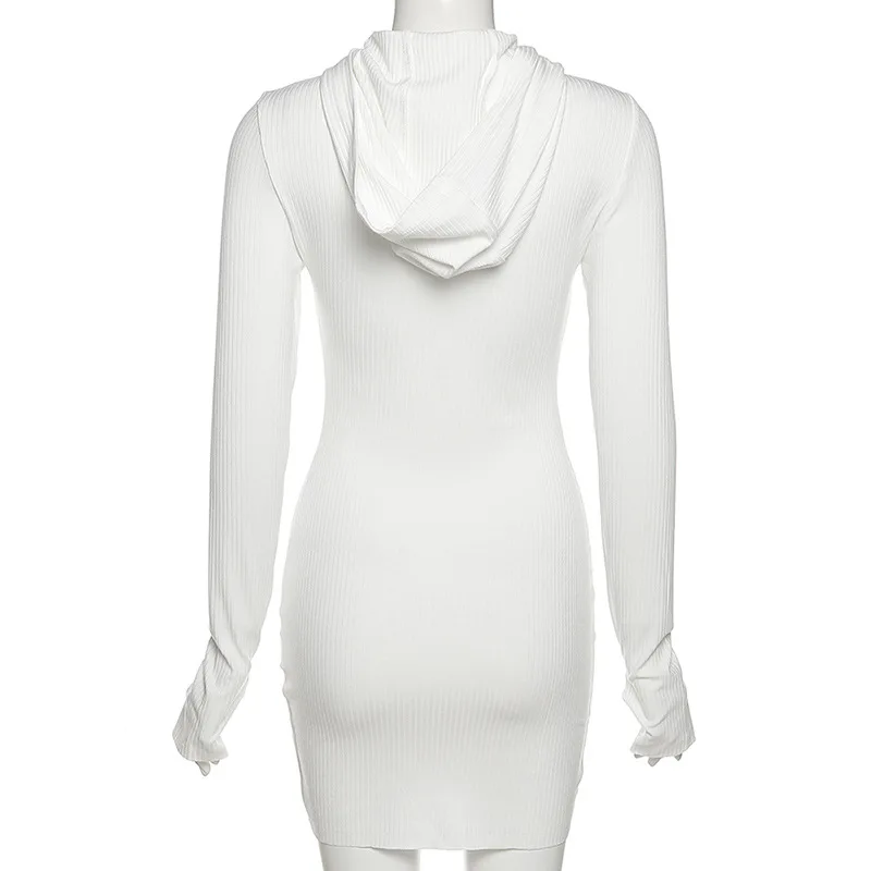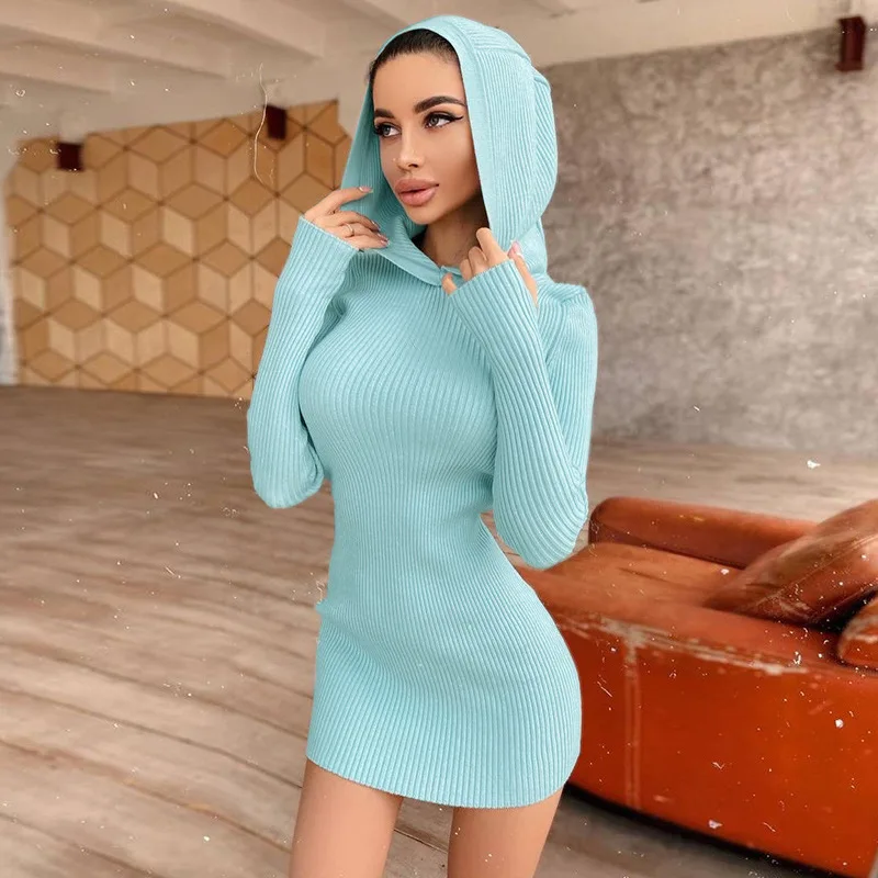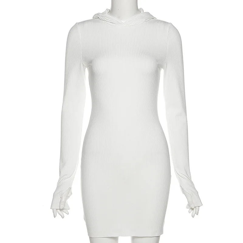 Y2K 2022 весенне-осенние модные черные женские вязаные платья с длинным рукавом и капюшоном, базовые облегающие наряды для вечерние, одежда