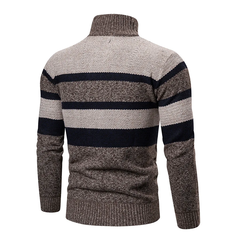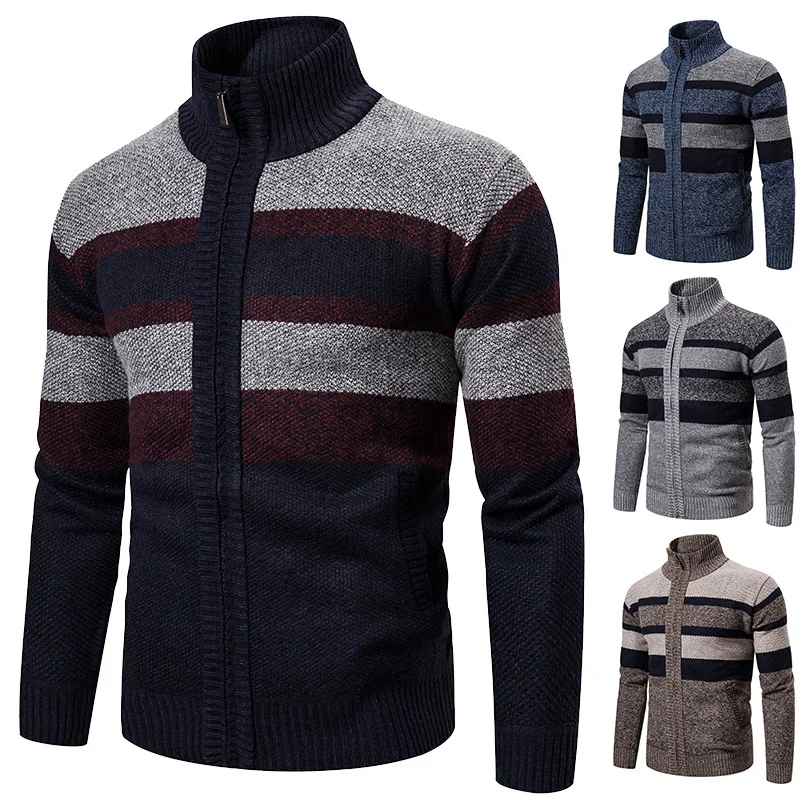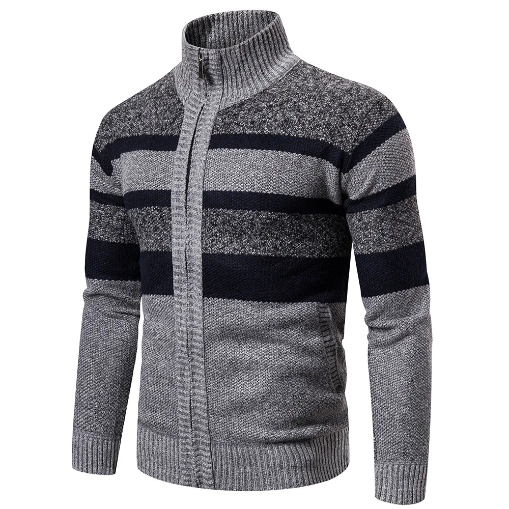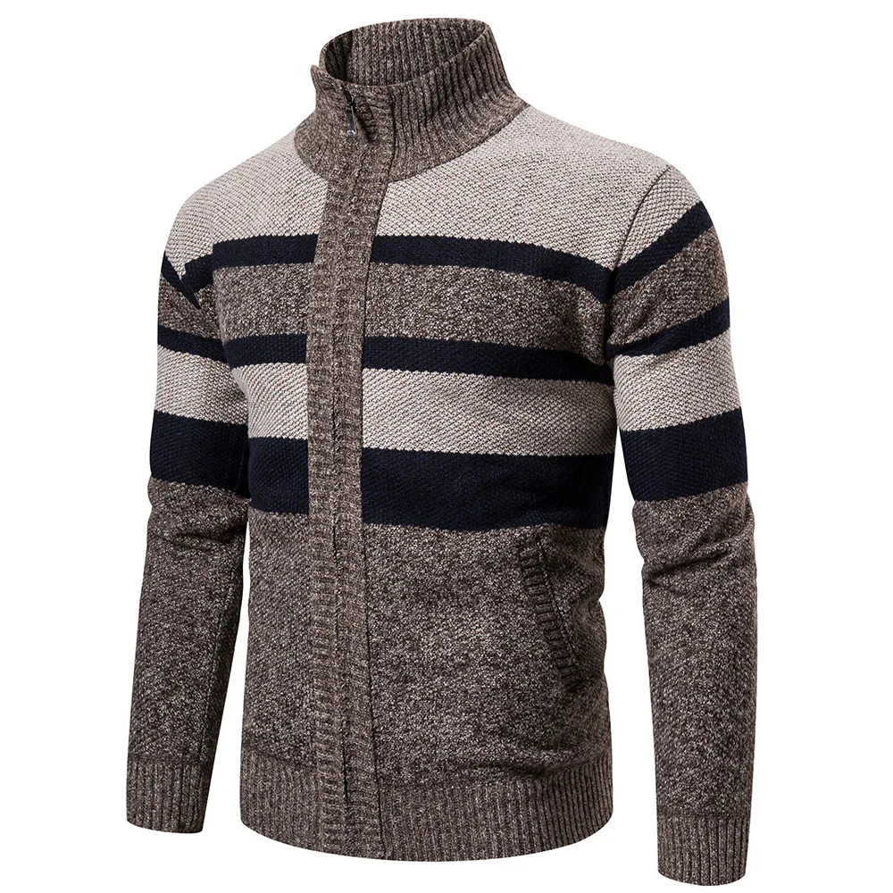 Мужской утепленный плюшевый свитер, трикотажный кардиган с воротником-стойкой и цветным блокировкой, Осень-зима