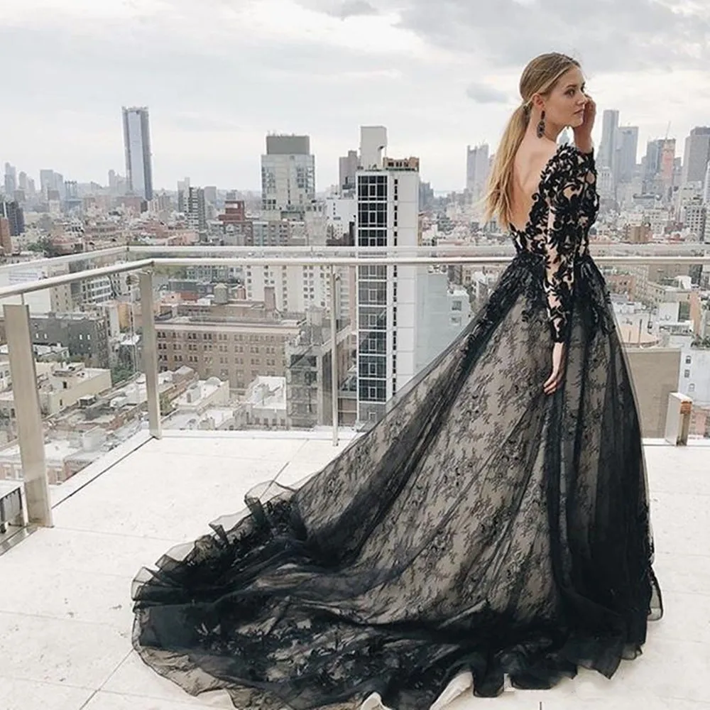 Черное свадебное платье с длинным рукавом, винтажное кружевное свадебное платье, свадебное платье